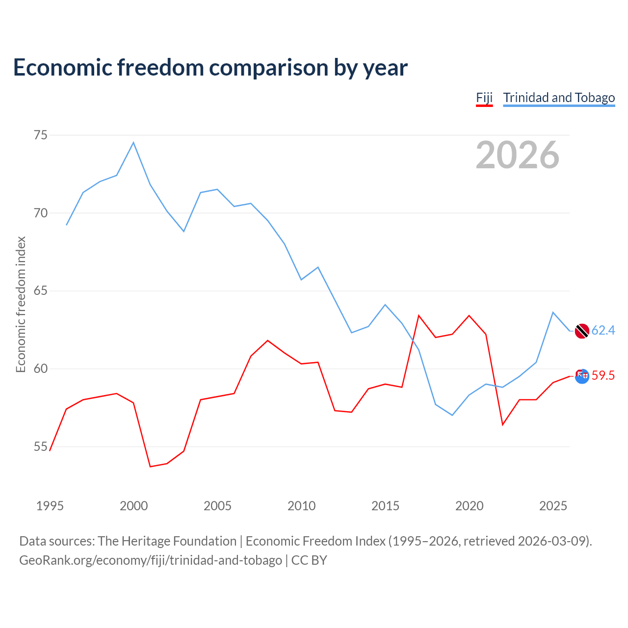 The Economic Freedom Index for Fiji is 59.5, ranking 103/197, compared to 62.4 for Trinidad and Tobago, ranking 87/197. The chart above displays a comparison of annual changes in economic freedom indexes.