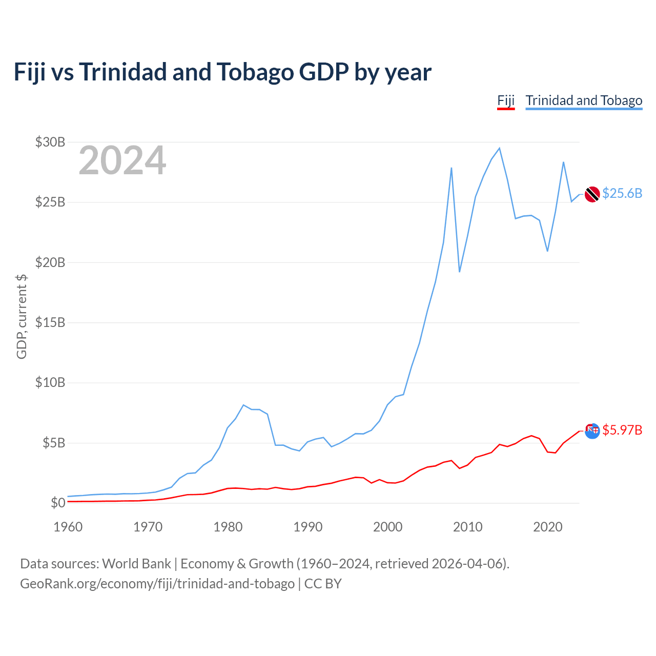 Fiji has a GDP of $5.97B compared to $25.6B for Trinidad and Tobago, ranking 161/197 and 115/197 by economy size, respectively.