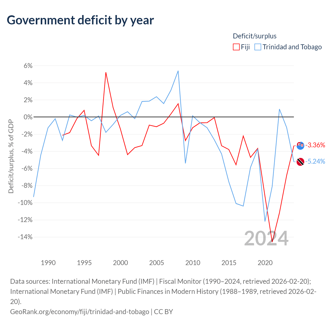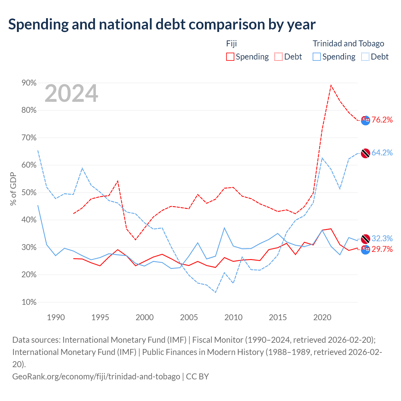 Fiji has $4.54B in government debt (76.2% of GDP), compared to $16.5B (64.2% of GDP) in Trinidad and Tobago.
