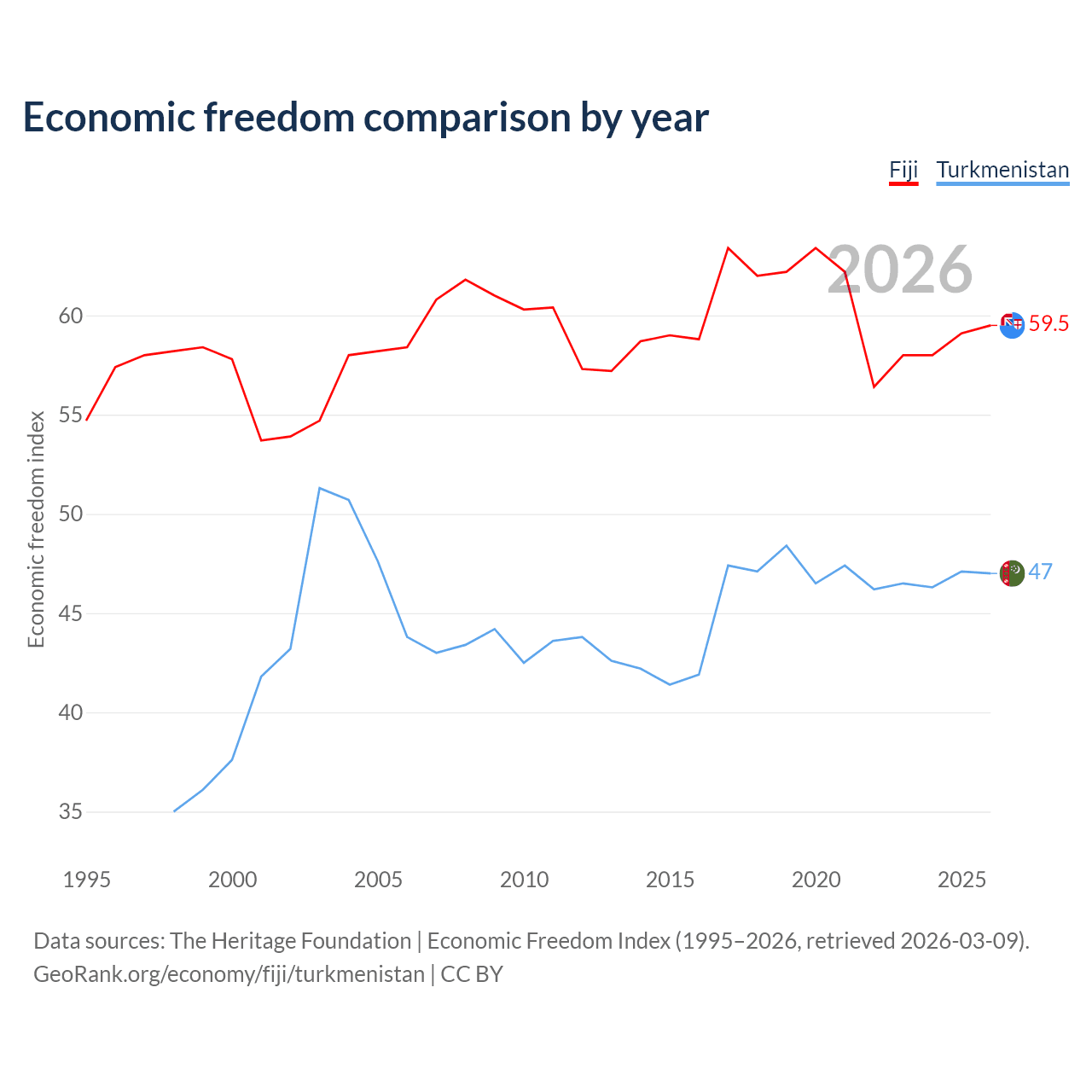 The Economic Freedom Index for Fiji is 59.5, ranking 103/197, compared to 47 for Turkmenistan, ranking 177/197. The chart above displays a comparison of annual changes in economic freedom indexes.