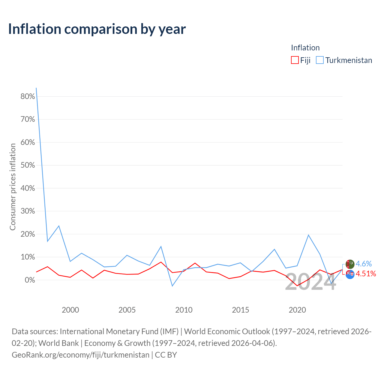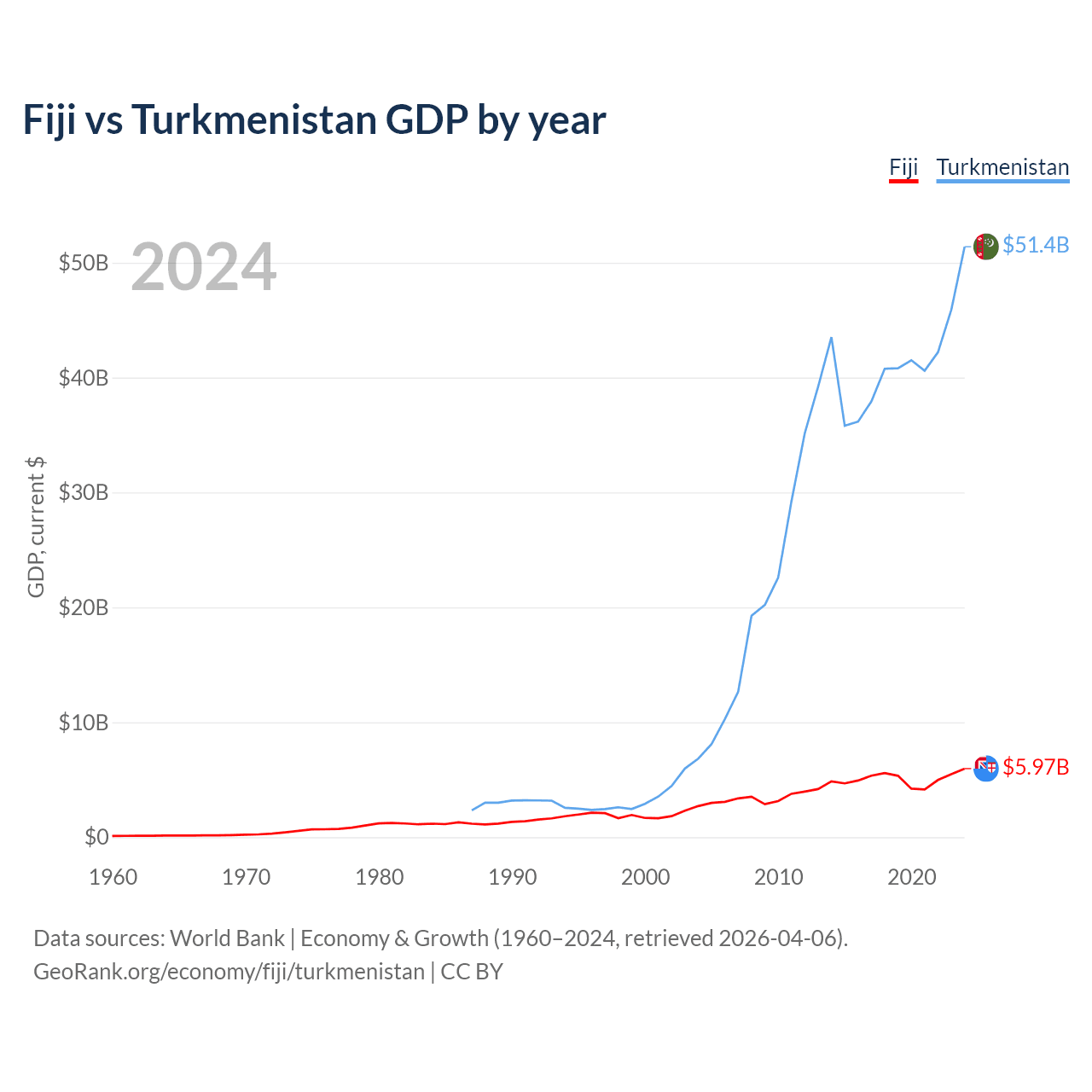Fiji has a GDP of $5.97B compared to $51.4B for Turkmenistan, ranking 161/197 and 92/197 by economy size, respectively.