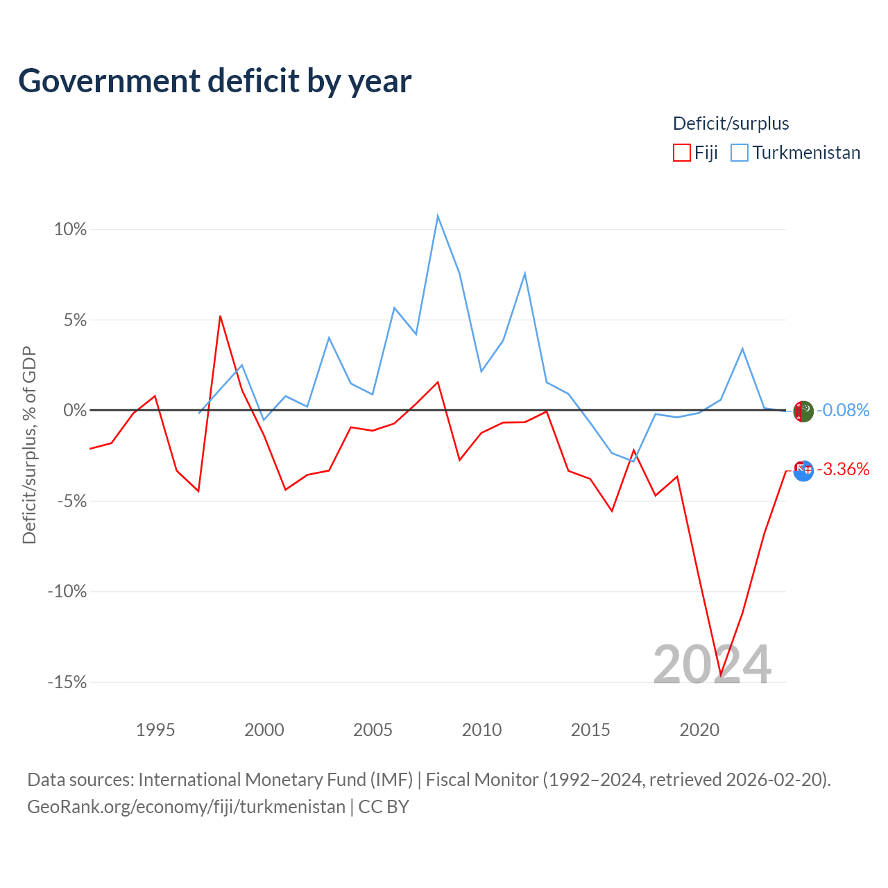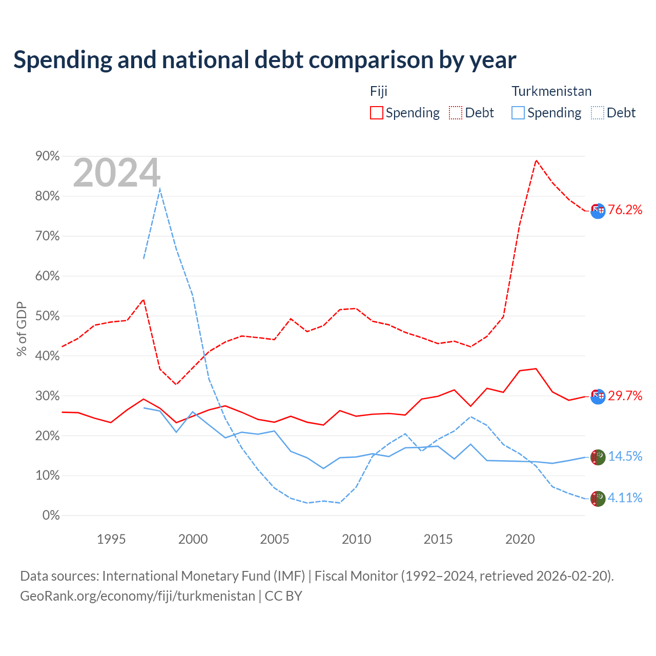 Fiji has $4.54B in government debt (76.2% of GDP), compared to $2.11B (4.11% of GDP) in Turkmenistan.