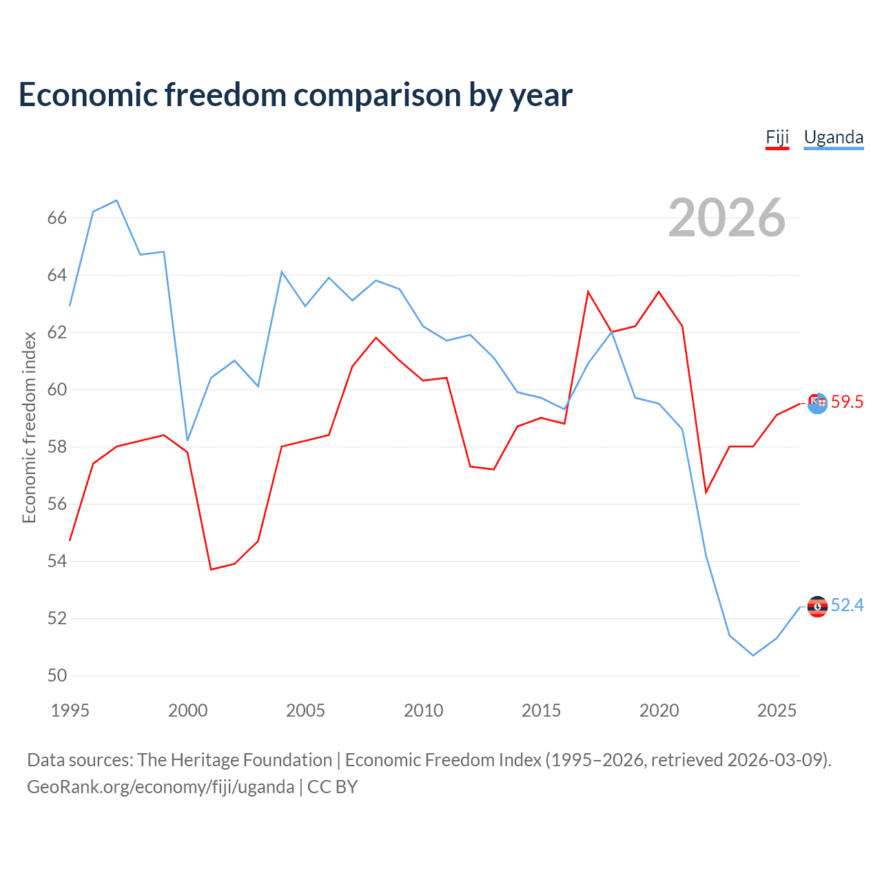 The Economic Freedom Index for Fiji is 59.5, ranking 103/197, compared to 52.4 for Uganda, ranking 149/197. The chart above displays a comparison of annual changes in economic freedom indexes.