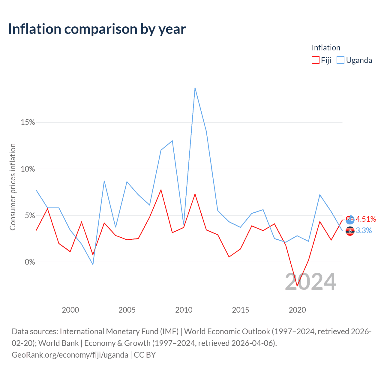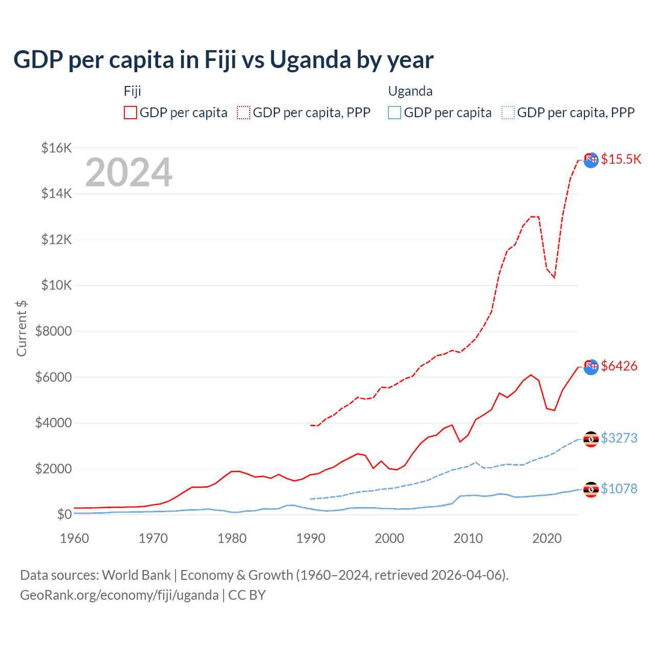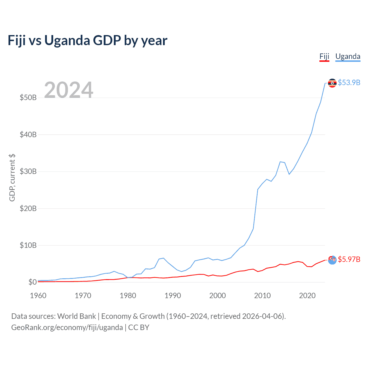 Fiji has a GDP of $5.97B compared to $53.9B for Uganda, ranking 161/197 and 89/197 by economy size, respectively.