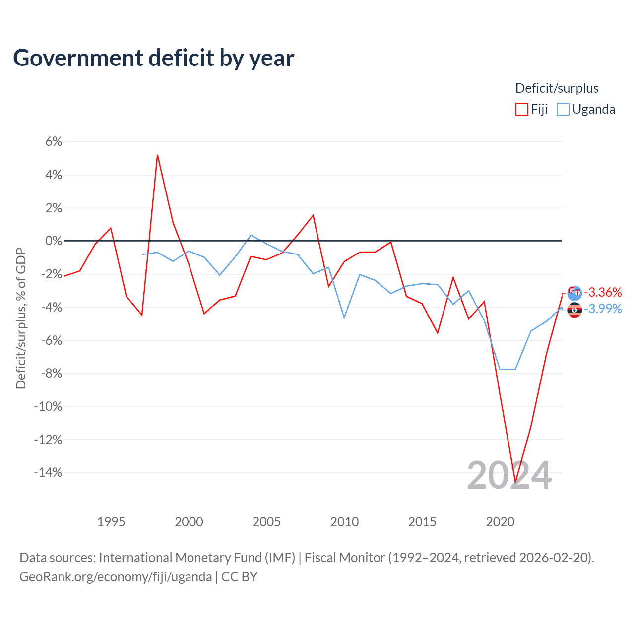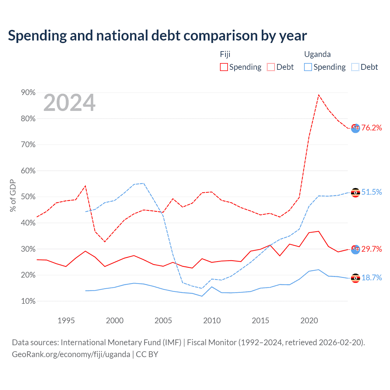 Fiji has $4.54B in government debt (76.2% of GDP), compared to $27.8B (51.5% of GDP) in Uganda.