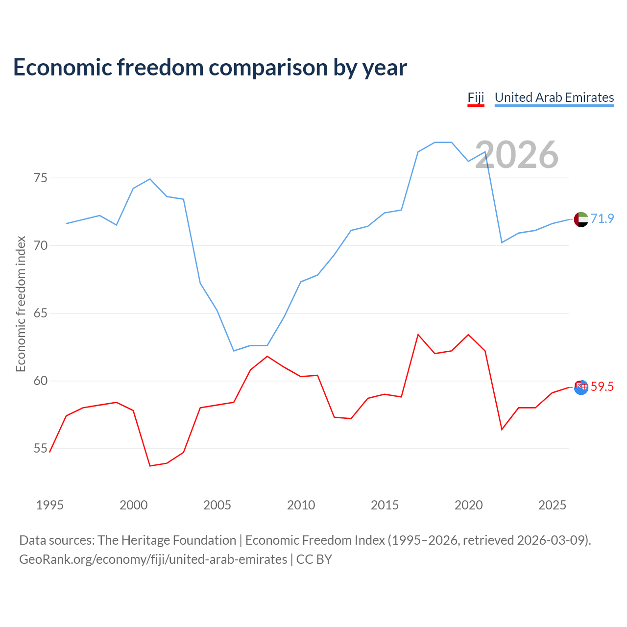 The Economic Freedom Index for Fiji is 59.5, ranking 103/197, compared to 71.9 for the United Arab Emirates, ranking 29/197. The chart above displays a comparison of annual changes in economic freedom indexes.