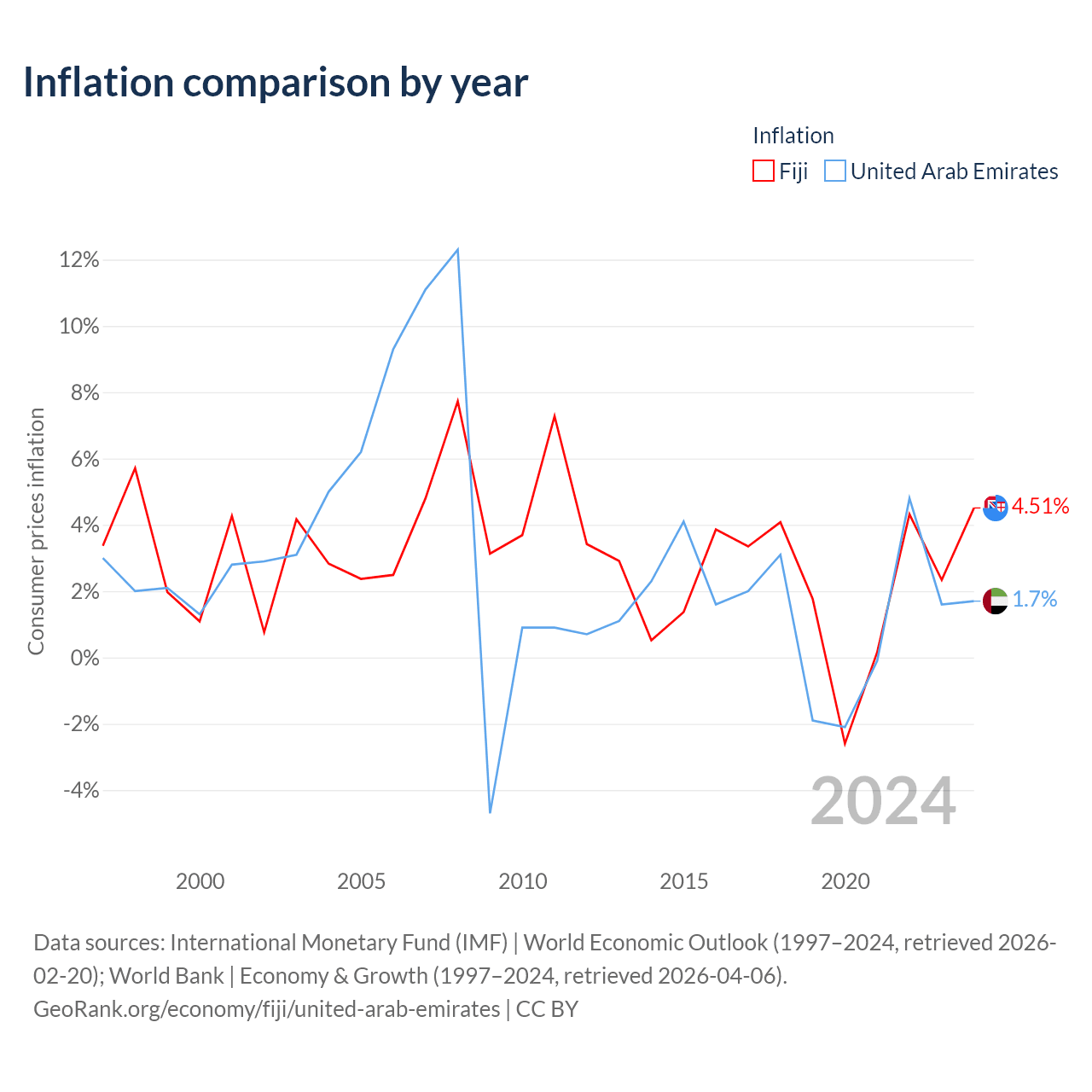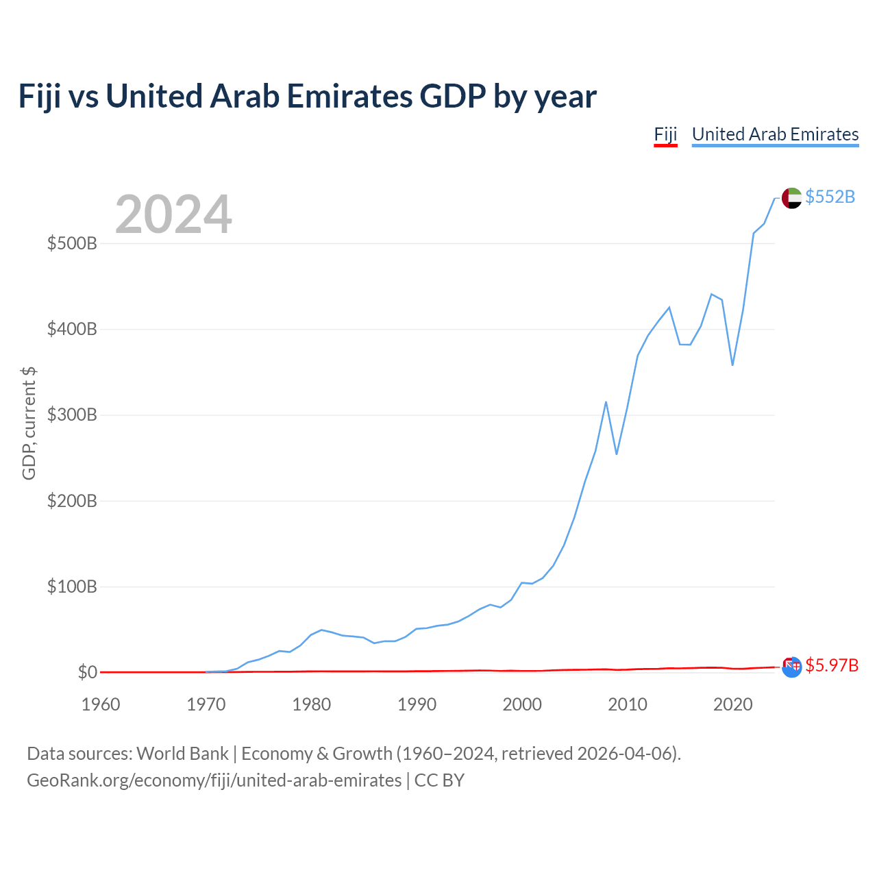 Fiji has a GDP of $5.97B compared to $552B for the United Arab Emirates, ranking 161/197 and 27/197 by economy size, respectively.