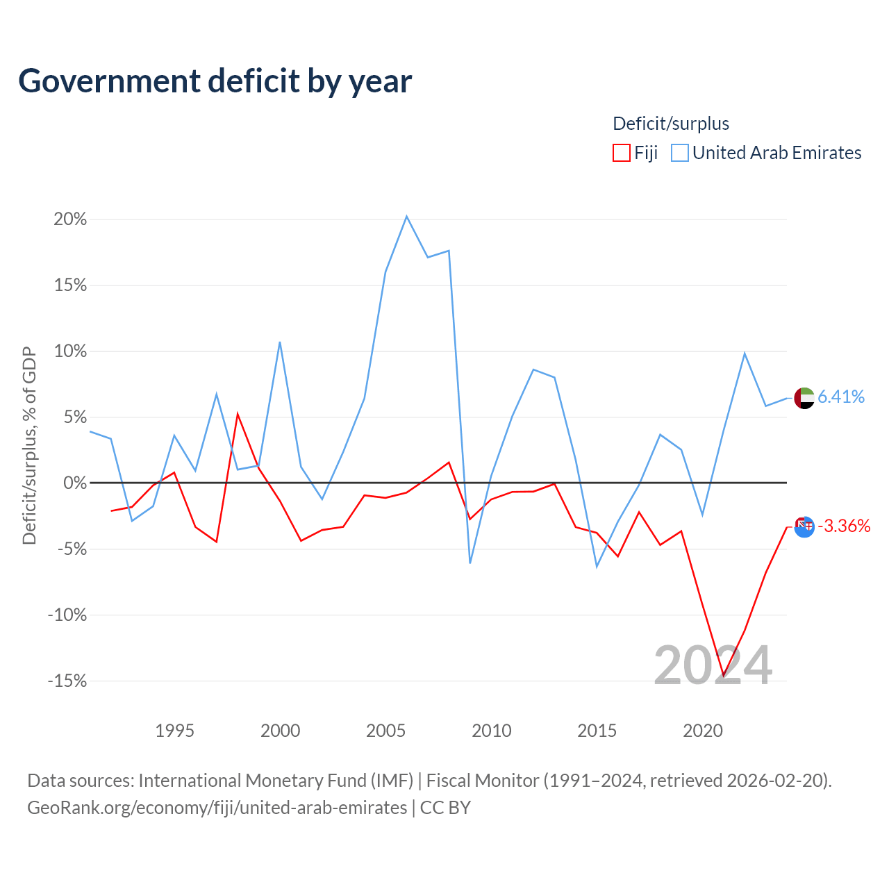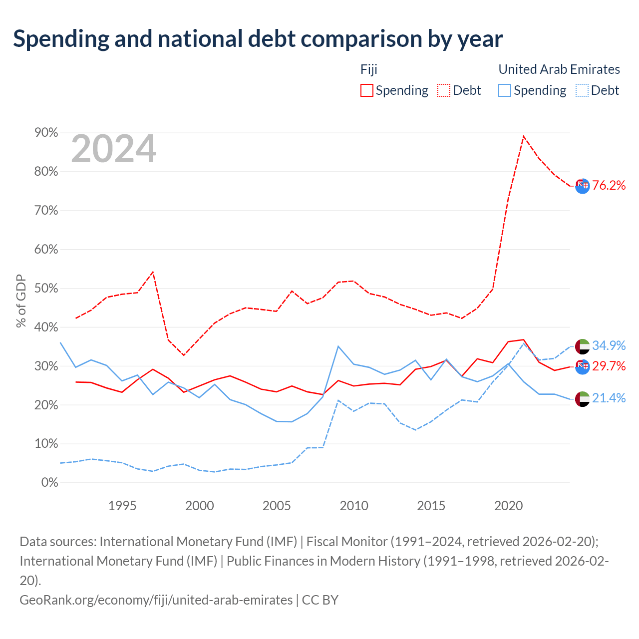 Fiji has $4.54B in government debt (76.2% of GDP), compared to $193B (34.9% of GDP) in the United Arab Emirates.