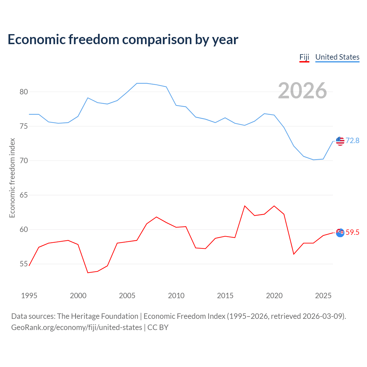 The Economic Freedom Index for Fiji is 59.5, ranking 103/197, compared to 72.8 for the United States, ranking 27/197. The chart above displays a comparison of annual changes in economic freedom indexes.