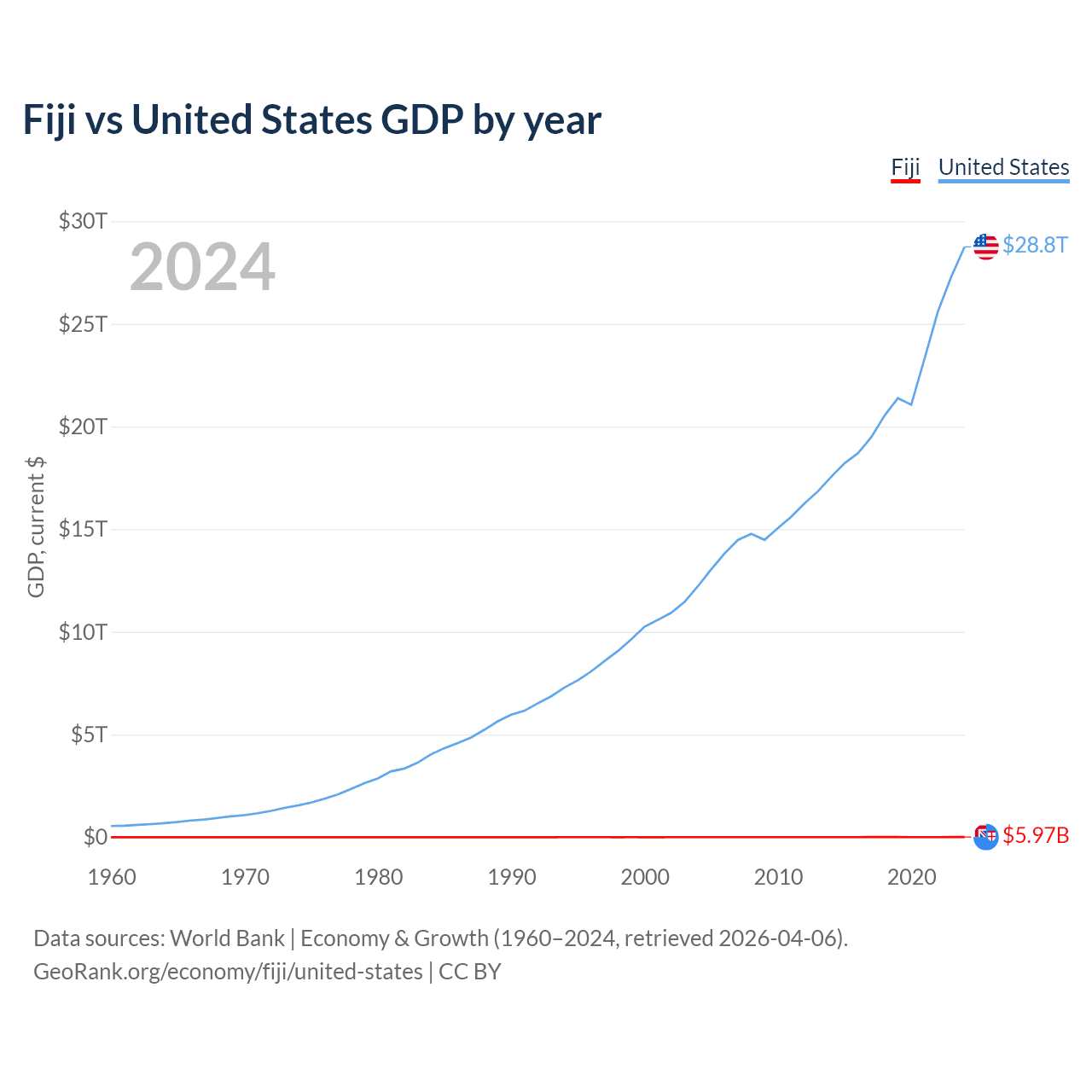 Fiji has a GDP of $5.97B compared to $28.8T for the United States, ranking 161/197 and 1/197 by economy size, respectively.