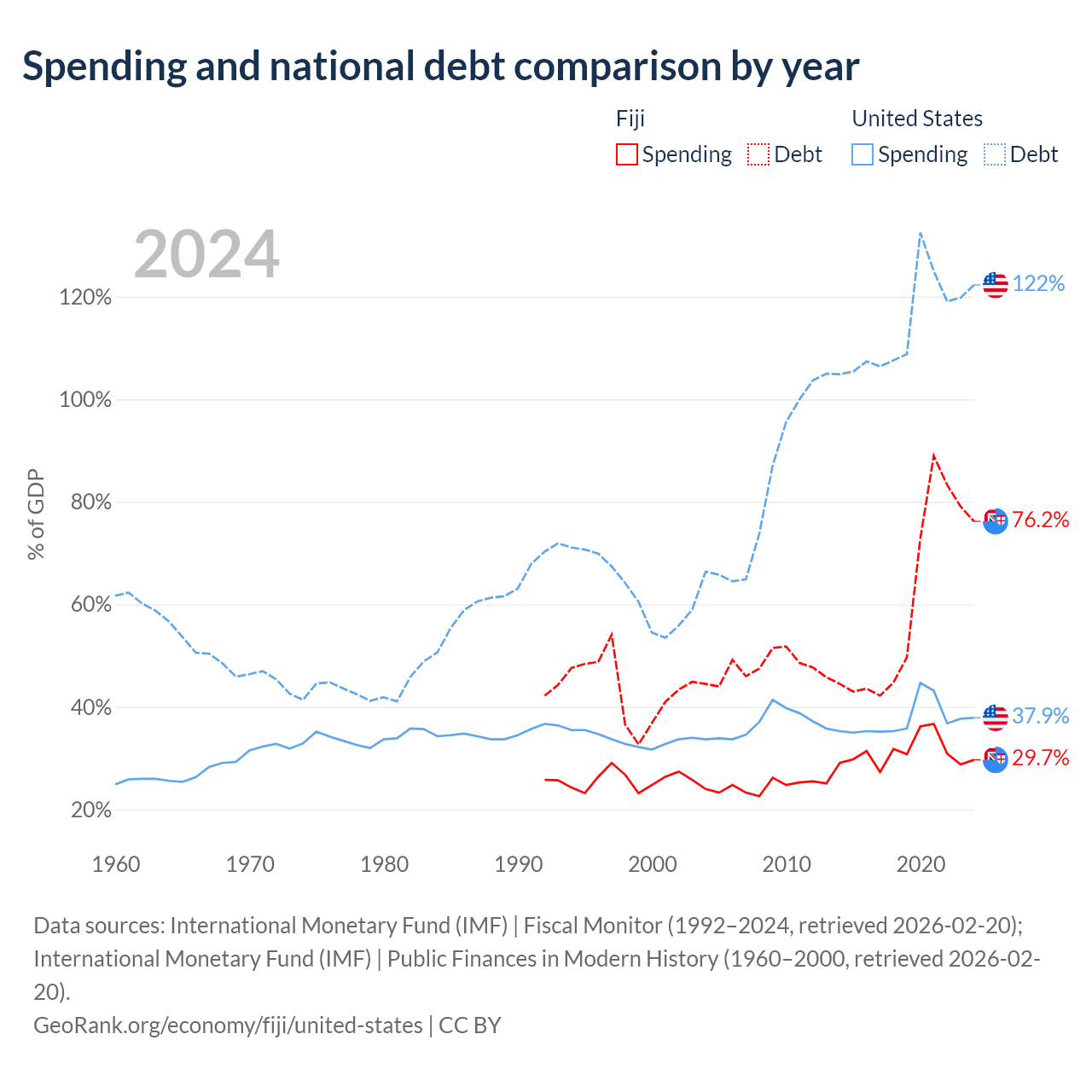 Fiji has $4.54B in government debt (76.2% of GDP), compared to $35.2T (122.3% of GDP) in the United States.