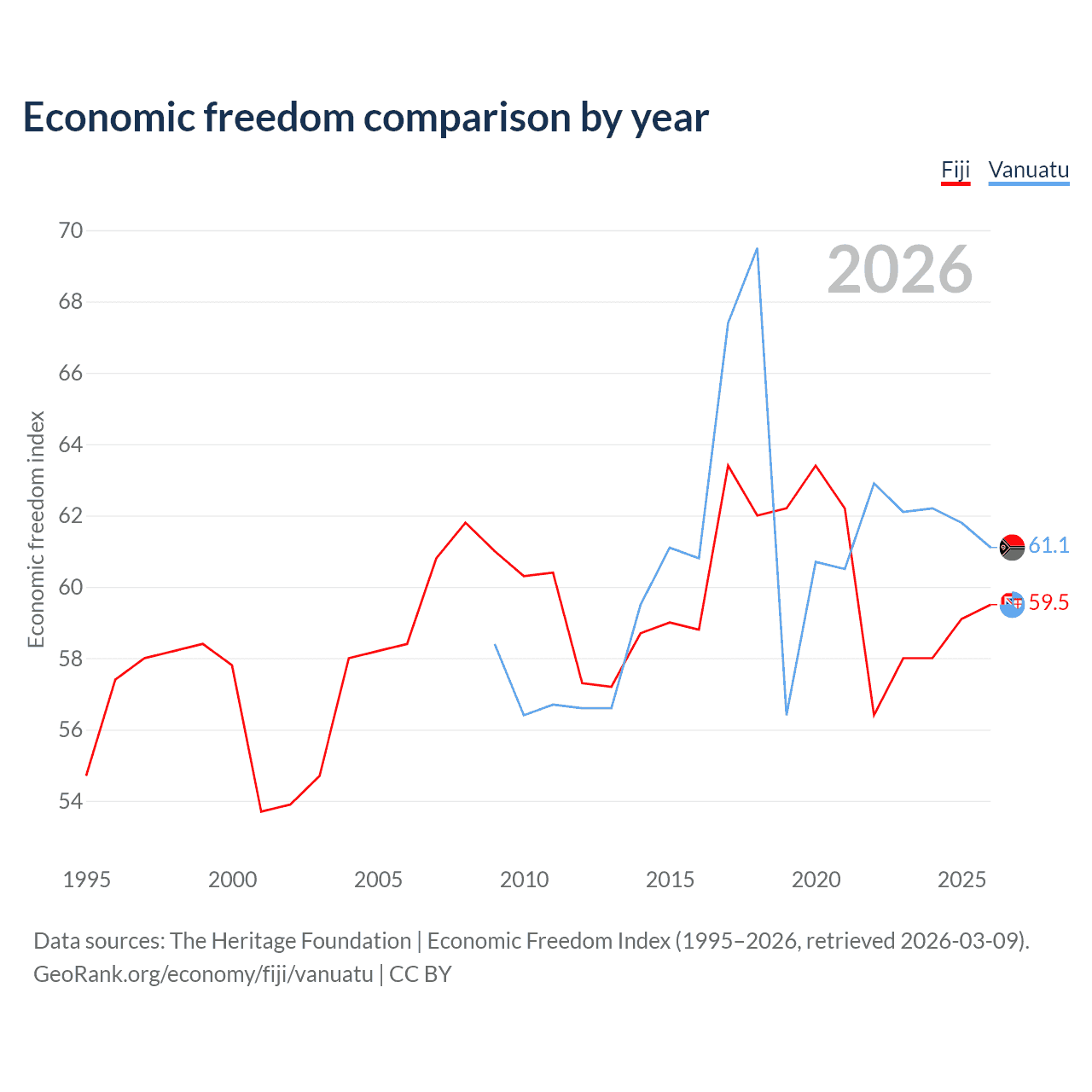 The Economic Freedom Index for Fiji is 59.5, ranking 103/197, compared to 61.1 for Vanuatu, ranking 92/197. The chart above displays a comparison of annual changes in economic freedom indexes.