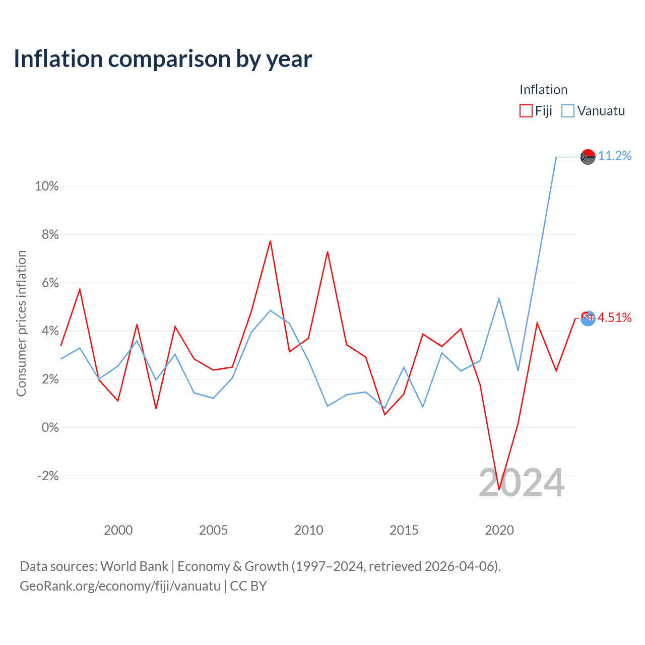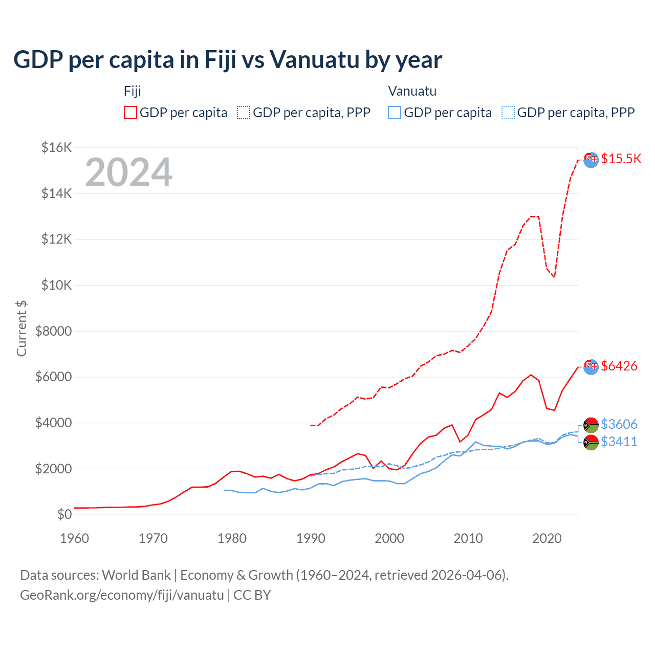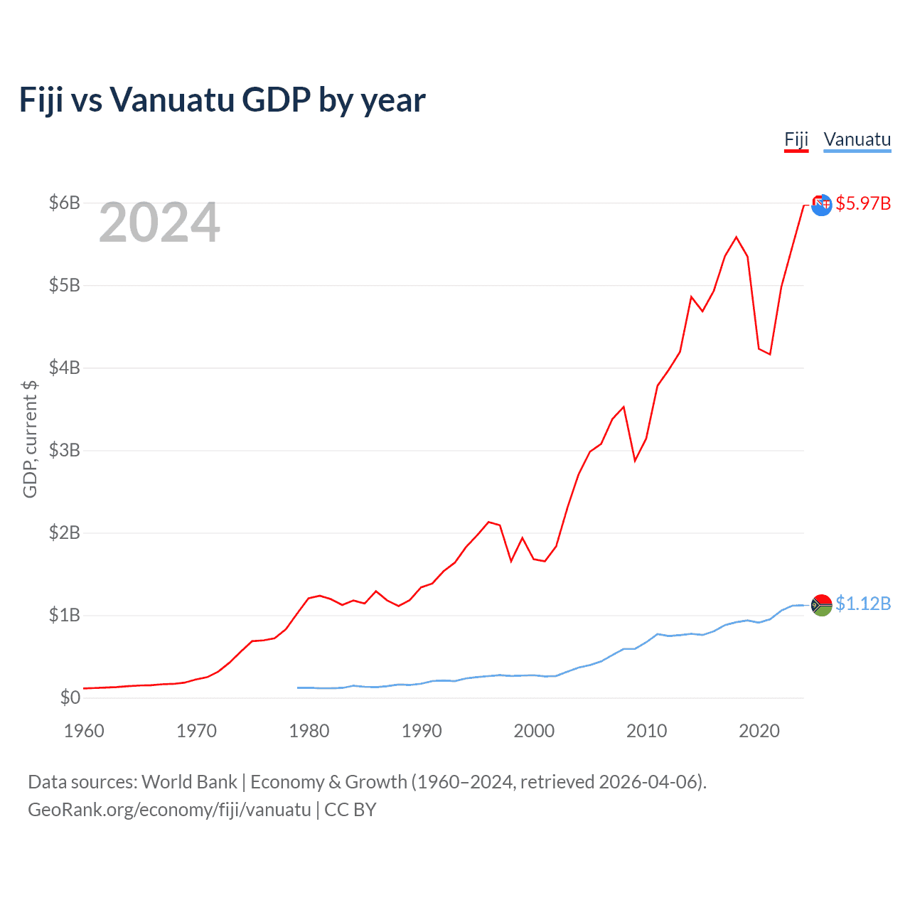Fiji has a GDP of $5.97B compared to $1.12B for Vanuatu, ranking 161/197 and 188/197 by economy size, respectively.