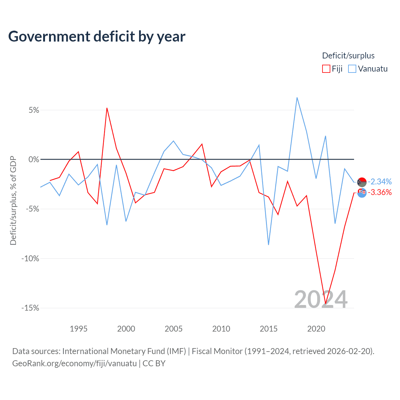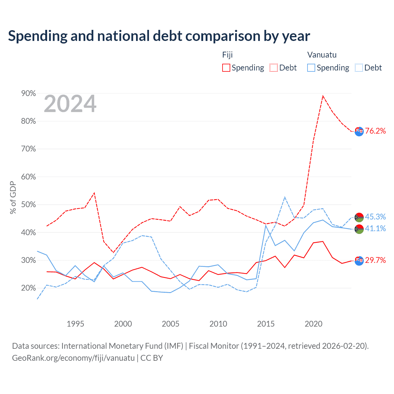 Fiji has $4.54B in government debt (76.2% of GDP), compared to $507M (45.3% of GDP) in Vanuatu.