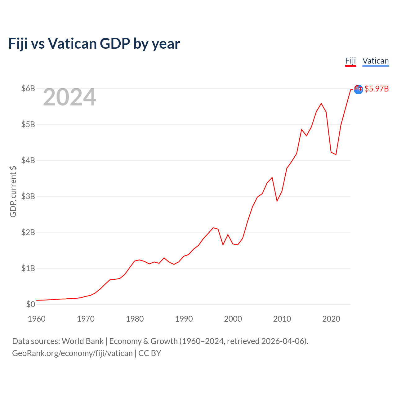 Fiji has a GDP of $5.97B compared to $19.8M for the Vatican, ranking 161/197 and 197/197 by economy size, respectively.