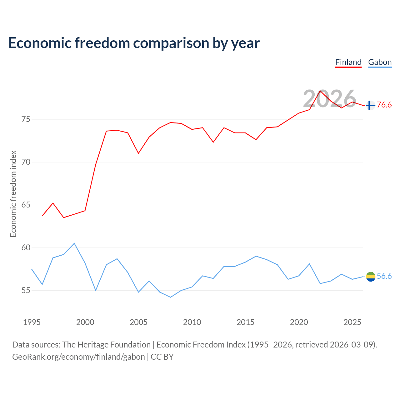 The Economic Freedom Index for Finland is 76.6, ranking 15/197, compared to 56.6 for Gabon, ranking 120/197. The chart above displays a comparison of annual changes in economic freedom indexes.
