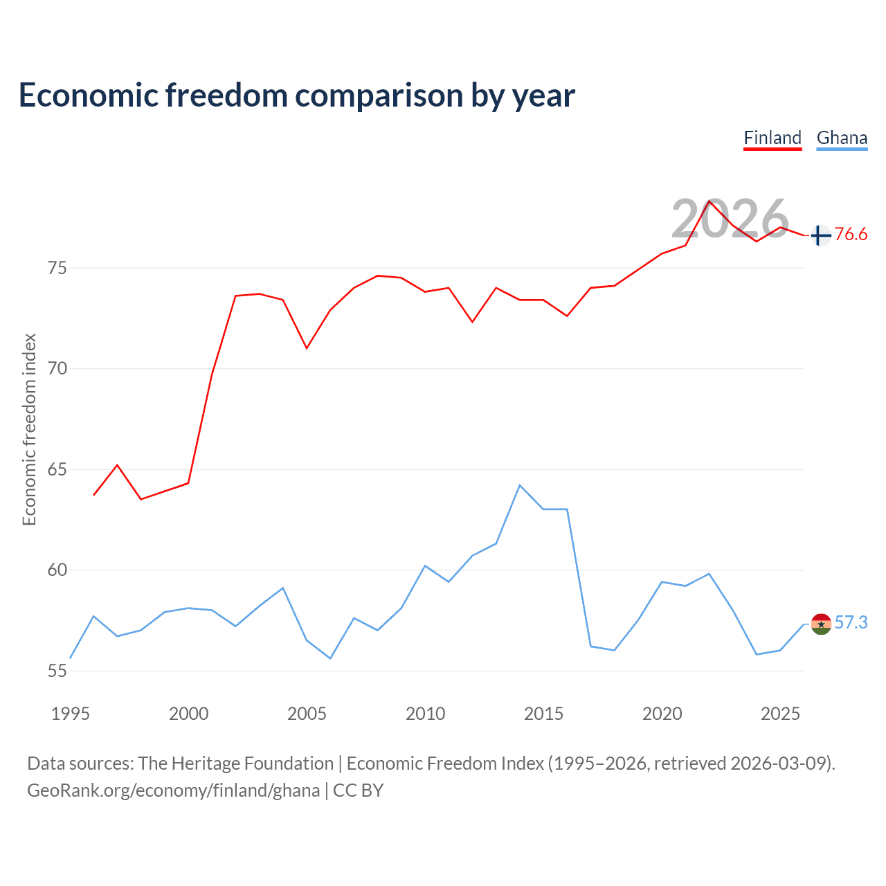The Economic Freedom Index for Finland is 76.6, ranking 15/197, compared to 57.3 for Ghana, ranking 118/197. The chart above displays a comparison of annual changes in economic freedom indexes.