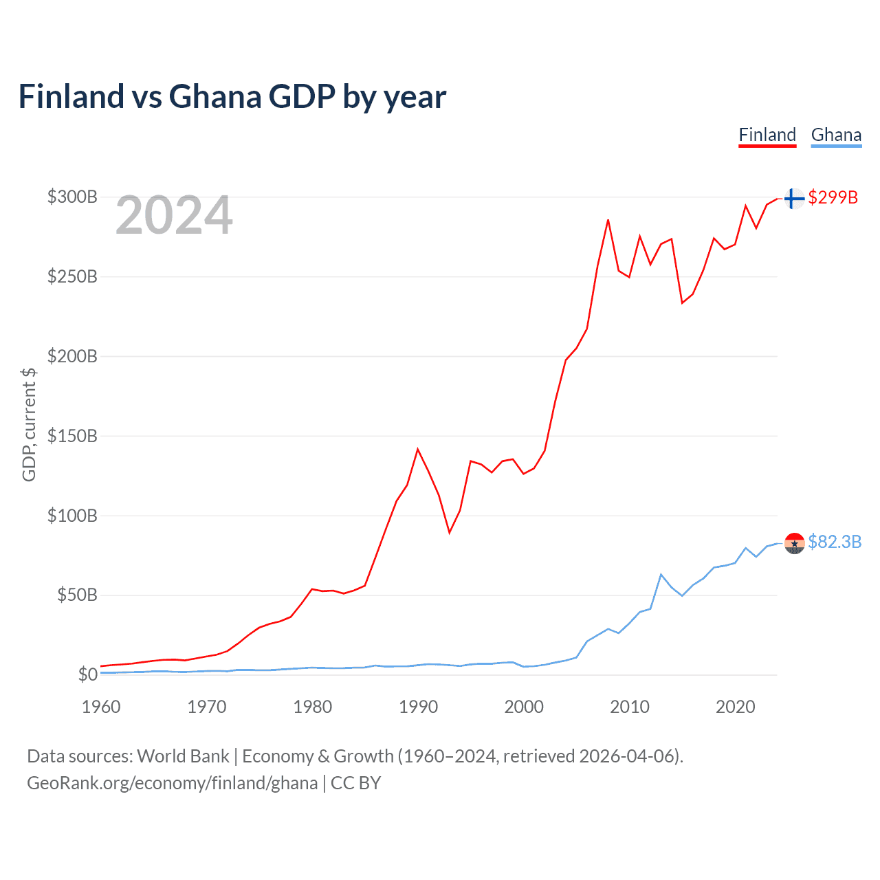 Finland has a GDP of $299B compared to $82.3B for Ghana, ranking 47/197 and 80/197 by economy size, respectively.