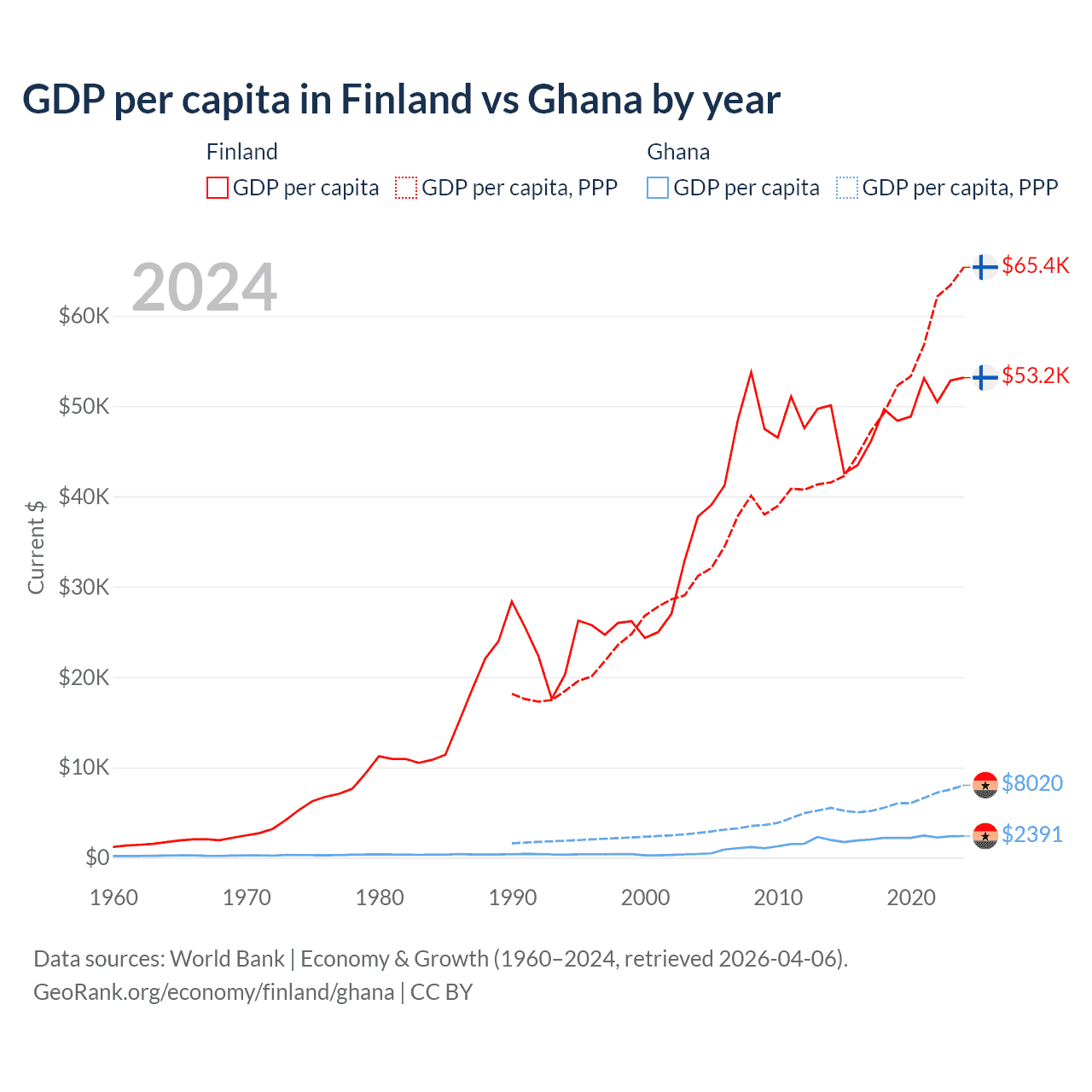 GDP per capita in Finland vs Ghana by year