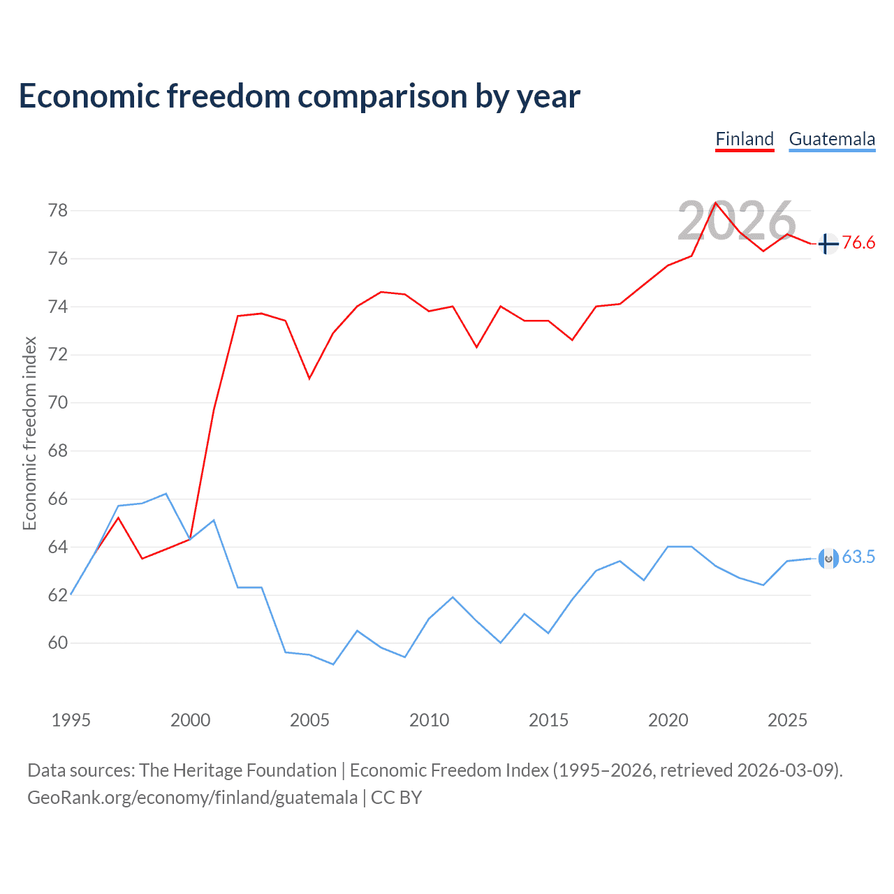 The Economic Freedom Index for Finland is 76.6, ranking 15/197, compared to 63.5 for Guatemala, ranking 79/197. The chart above displays a comparison of annual changes in economic freedom indexes.