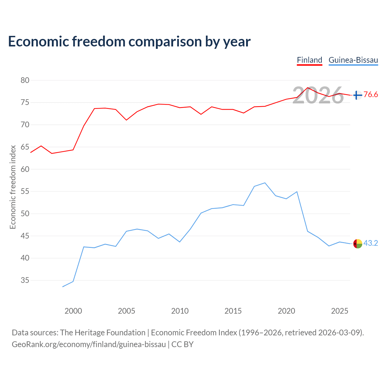 The Economic Freedom Index for Finland is 76.6, ranking 15/197, compared to 43.2 for Guinea-Bissau, ranking 181/197. The chart above displays a comparison of annual changes in economic freedom indexes.