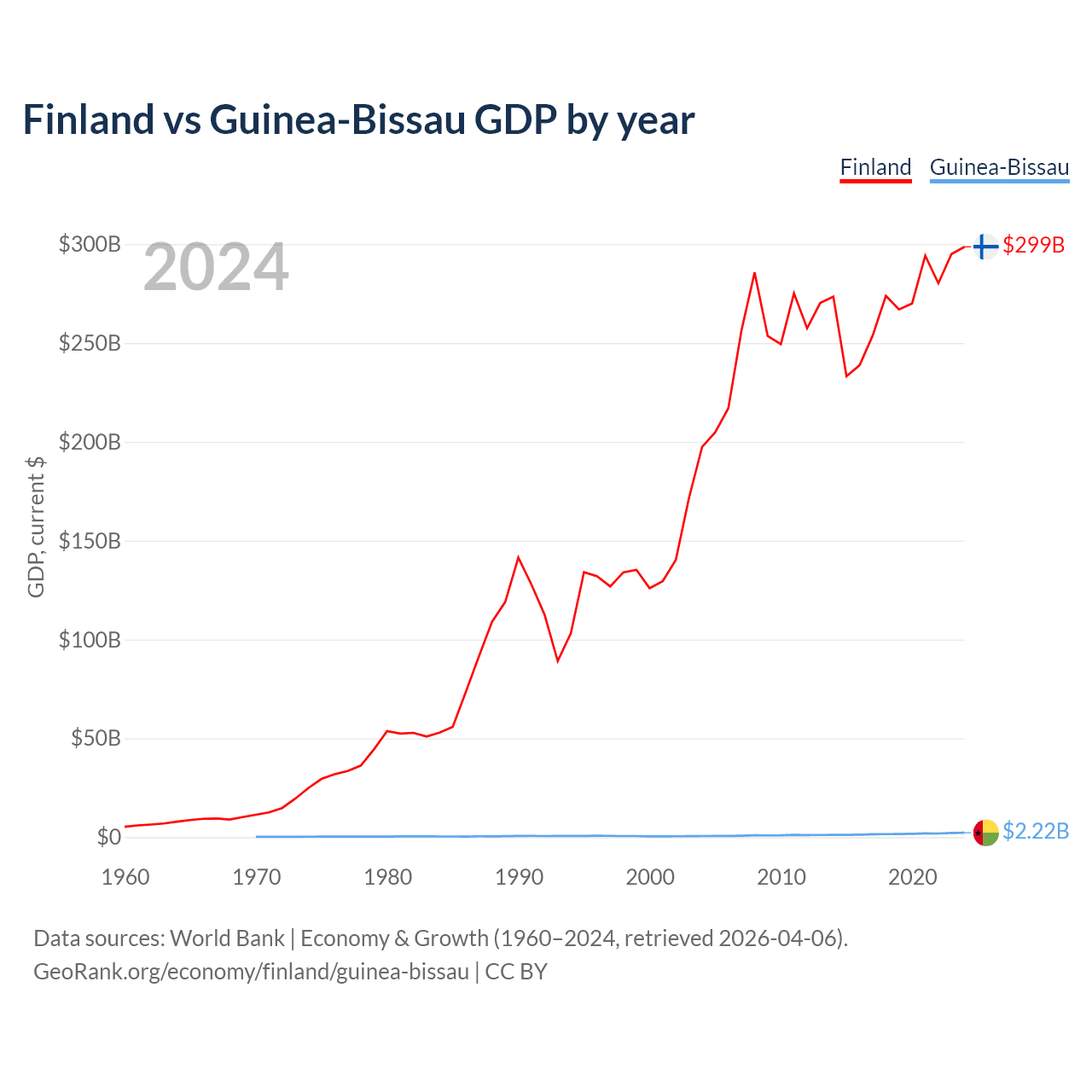 Finland has a GDP of $299B compared to $2.22B for Guinea-Bissau, ranking 47/197 and 176/197 by economy size, respectively.