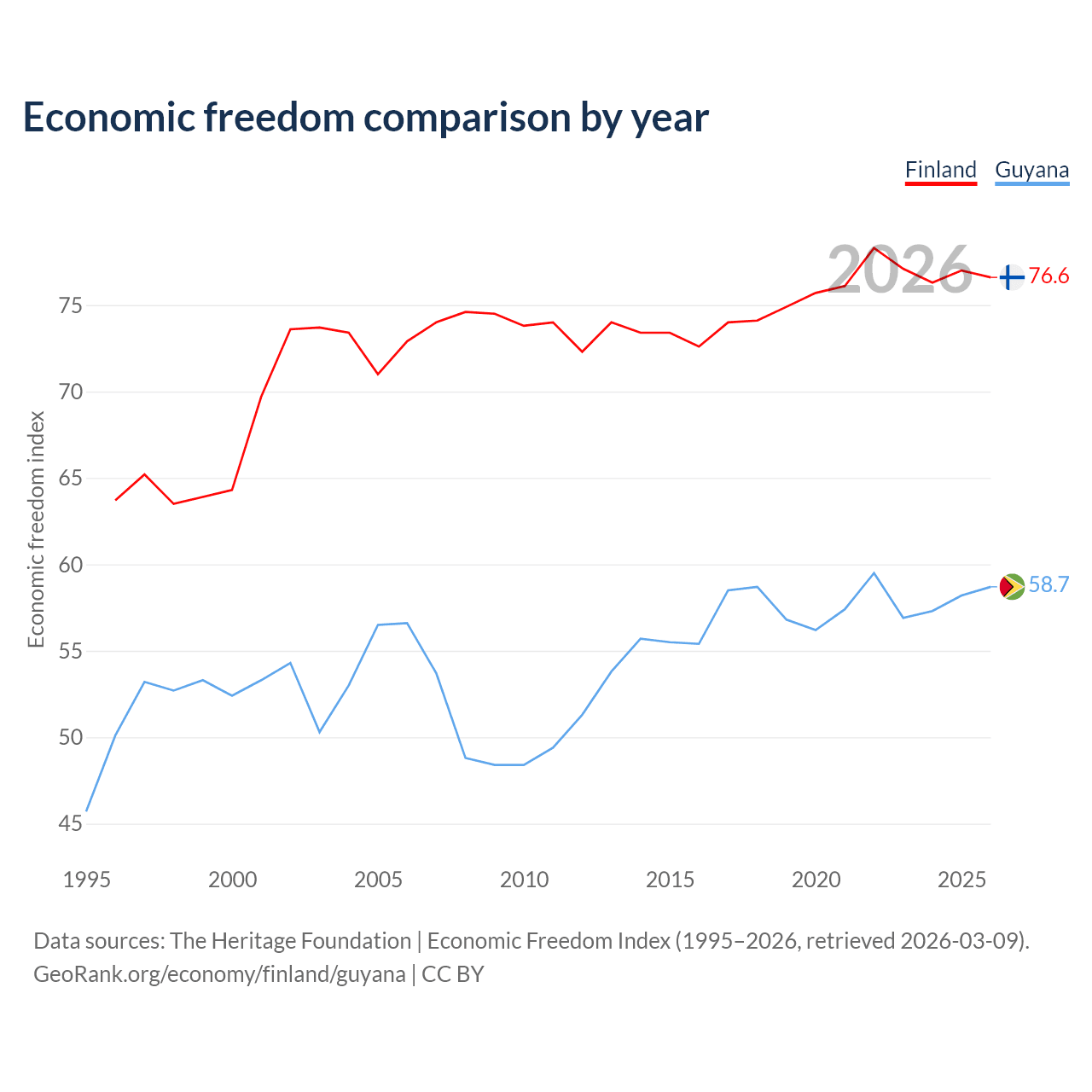 The Economic Freedom Index for Finland is 76.6, ranking 15/197, compared to 58.7 for Guyana, ranking 109/197. The chart above displays a comparison of annual changes in economic freedom indexes.