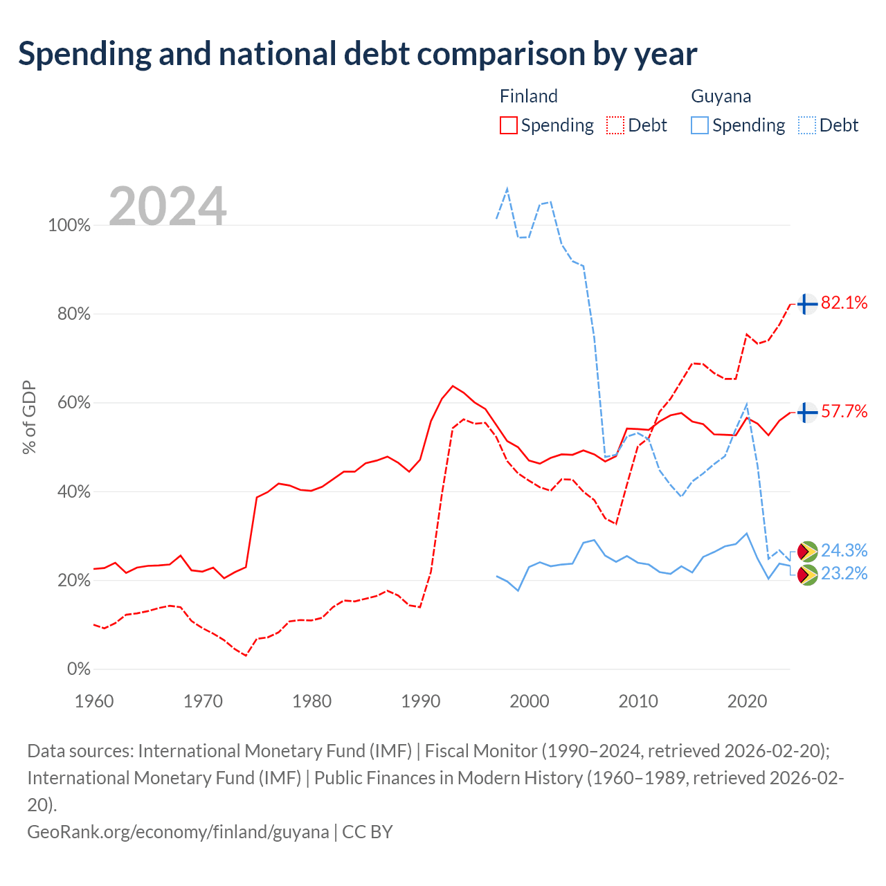 Finland has $245B in government debt (82.1% of GDP), compared to $5.99B (24.3% of GDP) in Guyana.