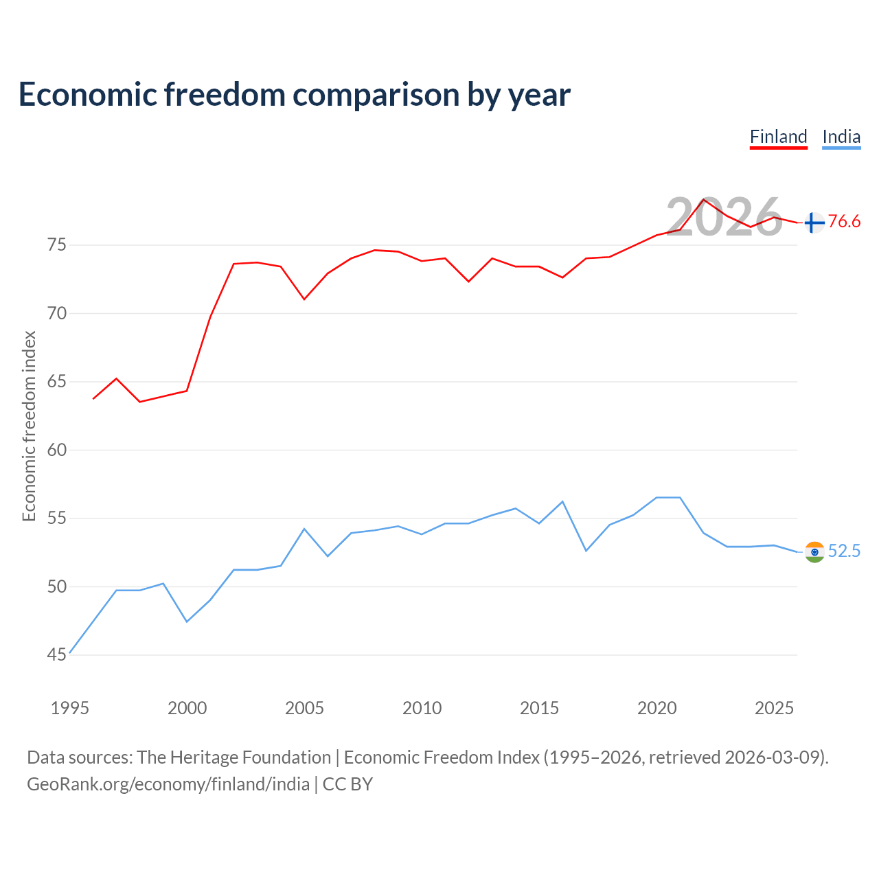 The Economic Freedom Index for Finland is 76.6, ranking 15/197, compared to 52.5 for India, ranking 146/197. The chart above displays a comparison of annual changes in economic freedom indexes.