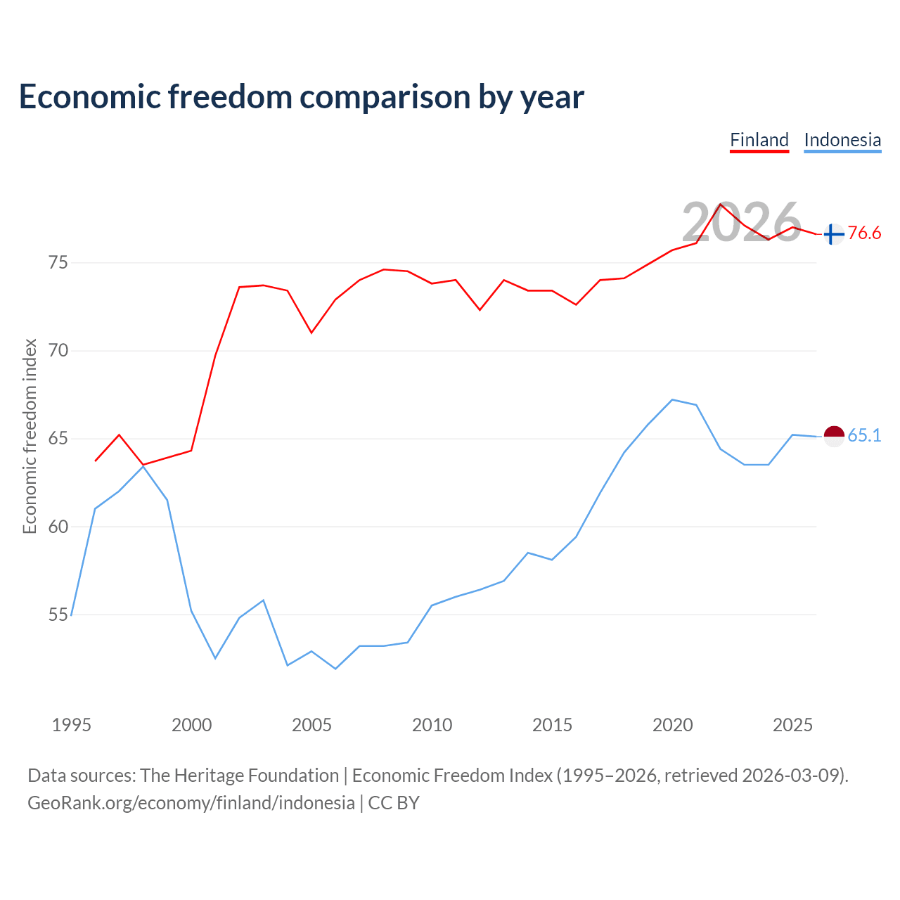 The Economic Freedom Index for Finland is 76.6, ranking 15/197, compared to 65.1 for Indonesia, ranking 67/197. The chart above displays a comparison of annual changes in economic freedom indexes.