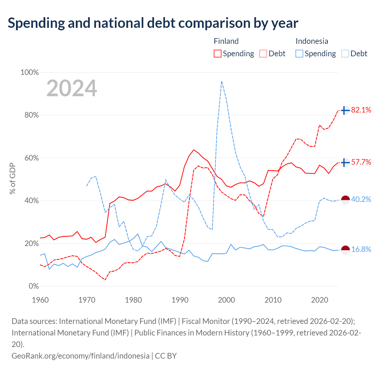 Finland has $245B in government debt (82.1% of GDP), compared to $561B (40.2% of GDP) in Indonesia.