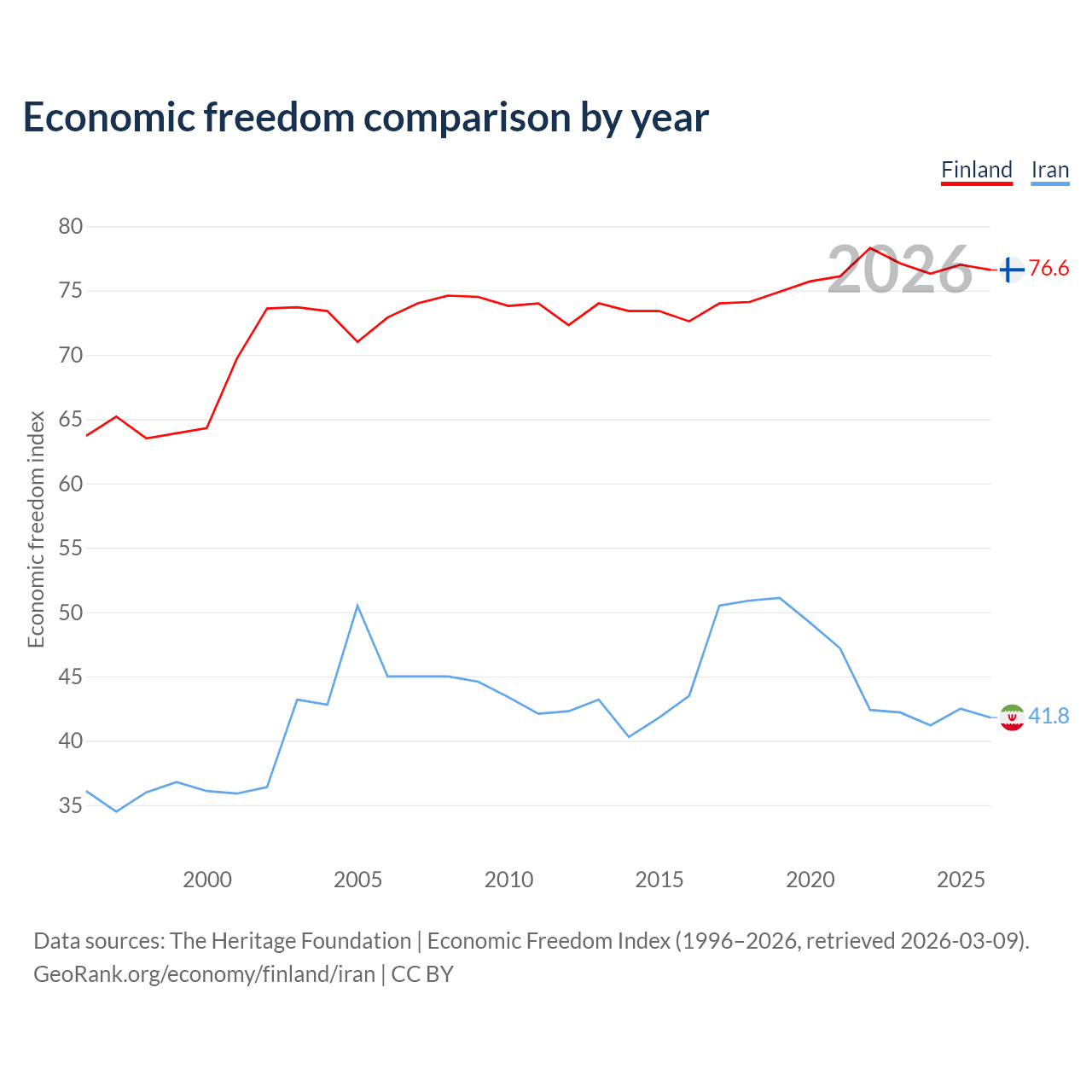 The Economic Freedom Index for Finland is 76.6, ranking 15/197, compared to 41.8 for Iran, ranking 185/197. The chart above displays a comparison of annual changes in economic freedom indexes.