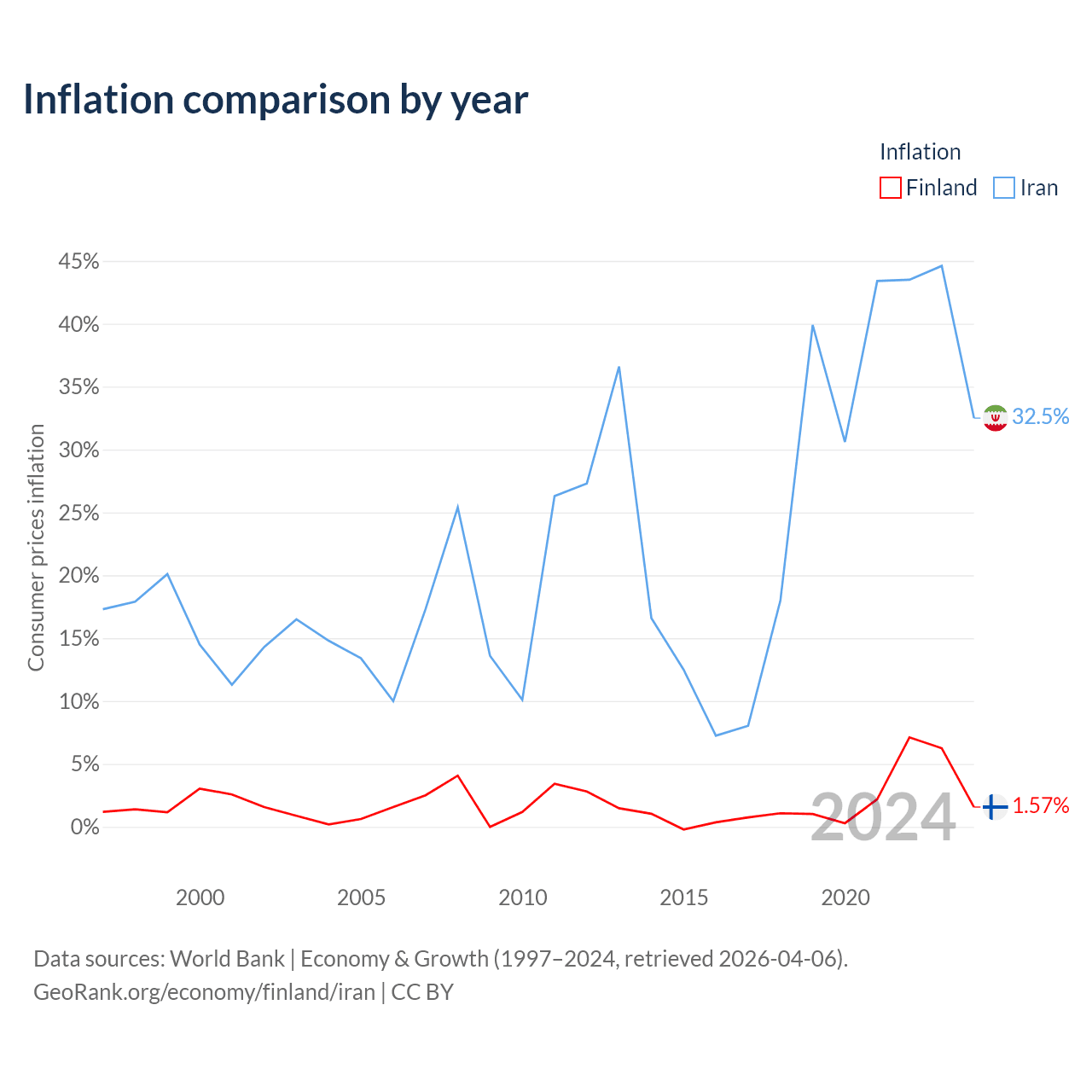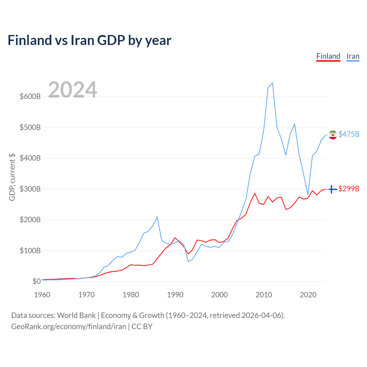 Finland has a GDP of $299B compared to $475B for Iran, ranking 47/197 and 34/197 by economy size, respectively.