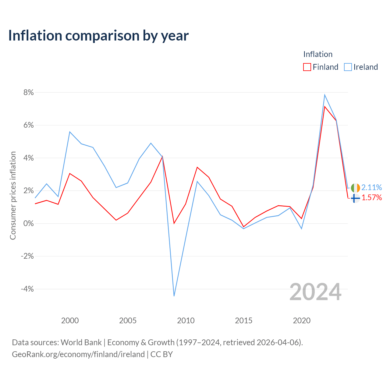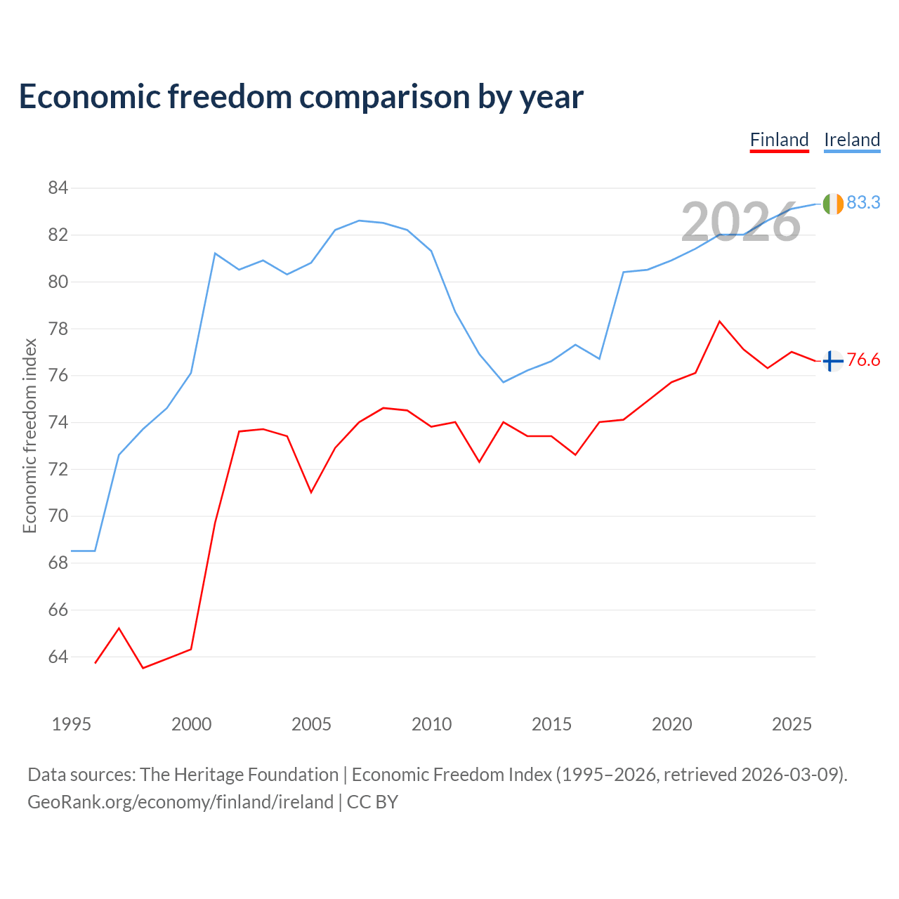 The Economic Freedom Index for Finland is 76.6, ranking 15/197, compared to 83.3 for Ireland, ranking 3/197. The chart above displays a comparison of annual changes in economic freedom indexes.