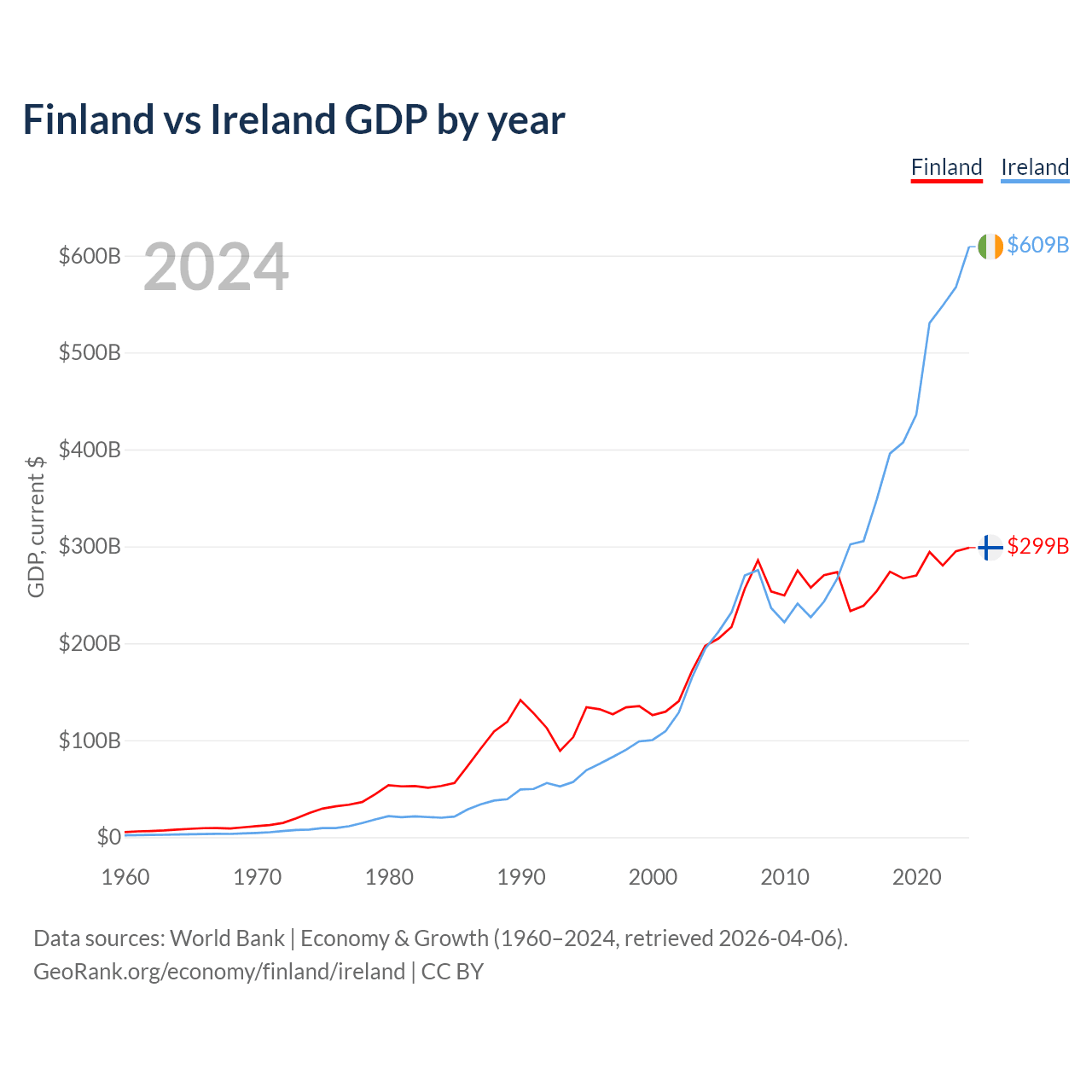 Finland has a GDP of $299B compared to $609B for Ireland, ranking 47/197 and 25/197 by economy size, respectively.