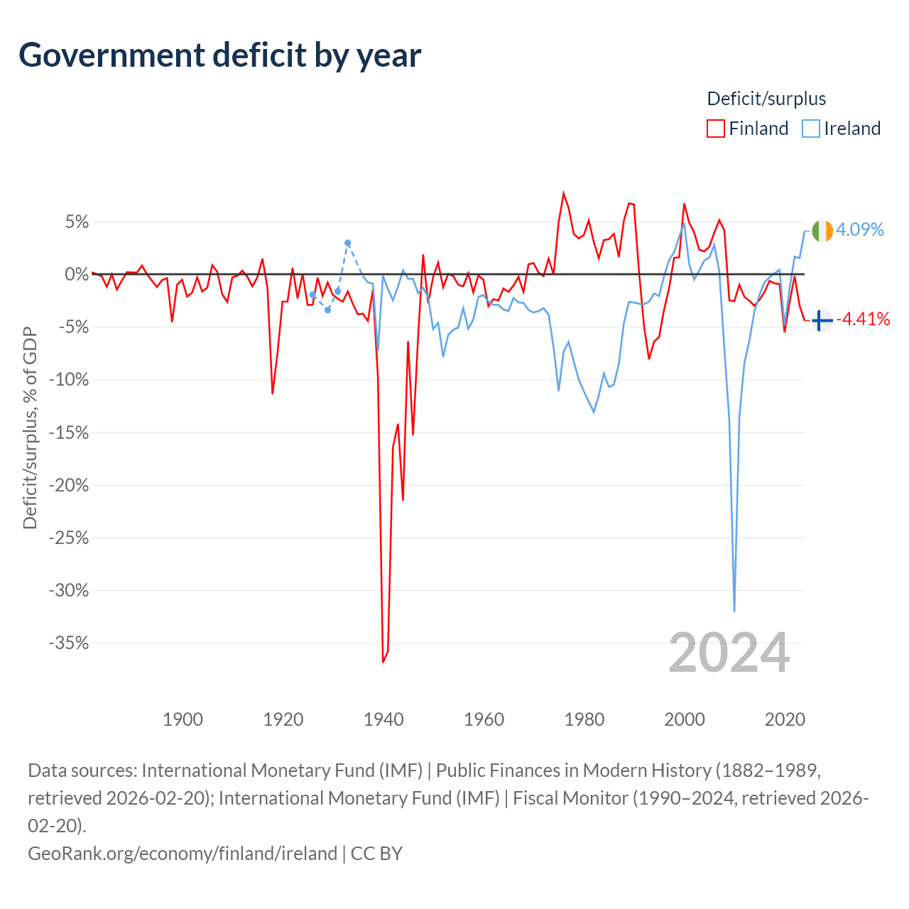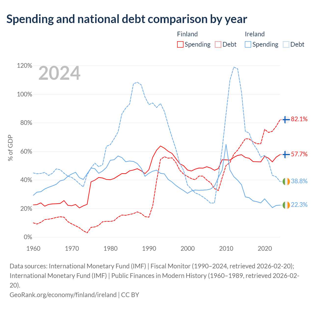 Finland has $245B in government debt (82.1% of GDP), compared to $236B (38.8% of GDP) in Ireland.