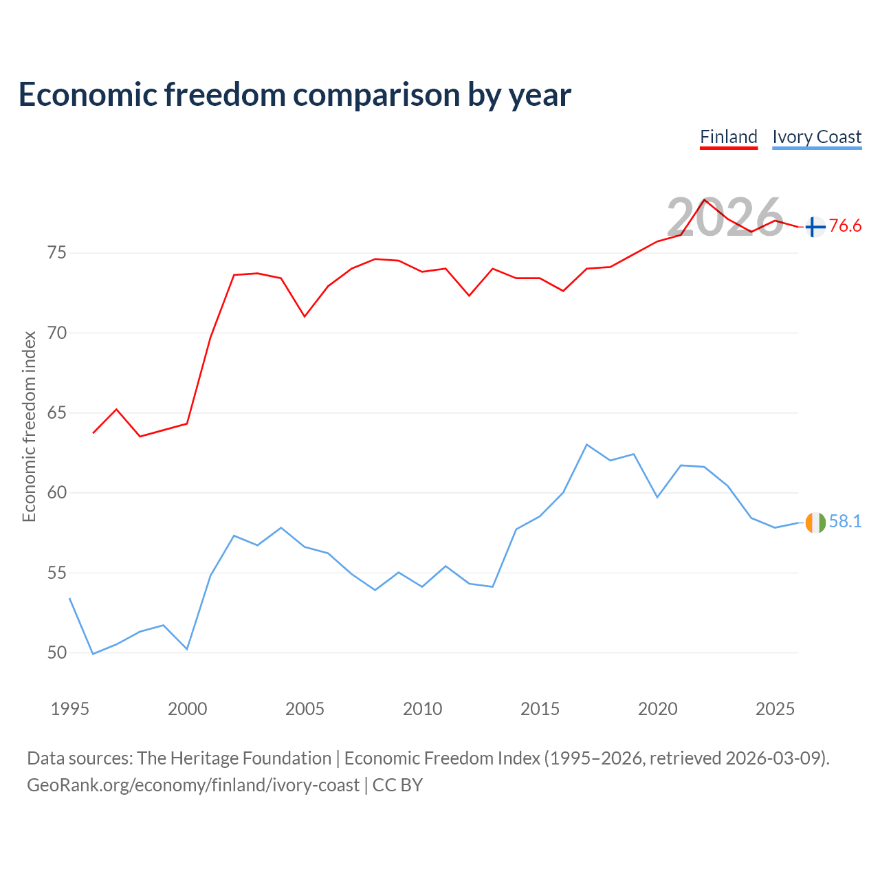 The Economic Freedom Index for Finland is 76.6, ranking 15/197, compared to 58.1 for Ivory Coast, ranking 111/197. The chart above displays a comparison of annual changes in economic freedom indexes.