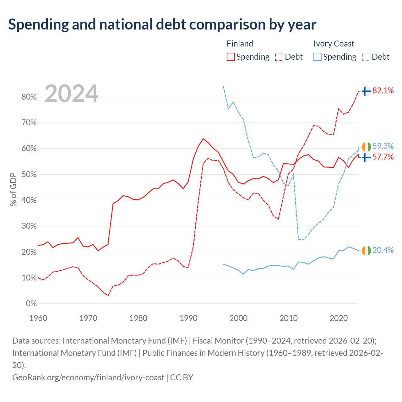 Finland has $245B in government debt (82.1% of GDP), compared to $51.6B (59.3% of GDP) in Ivory Coast.