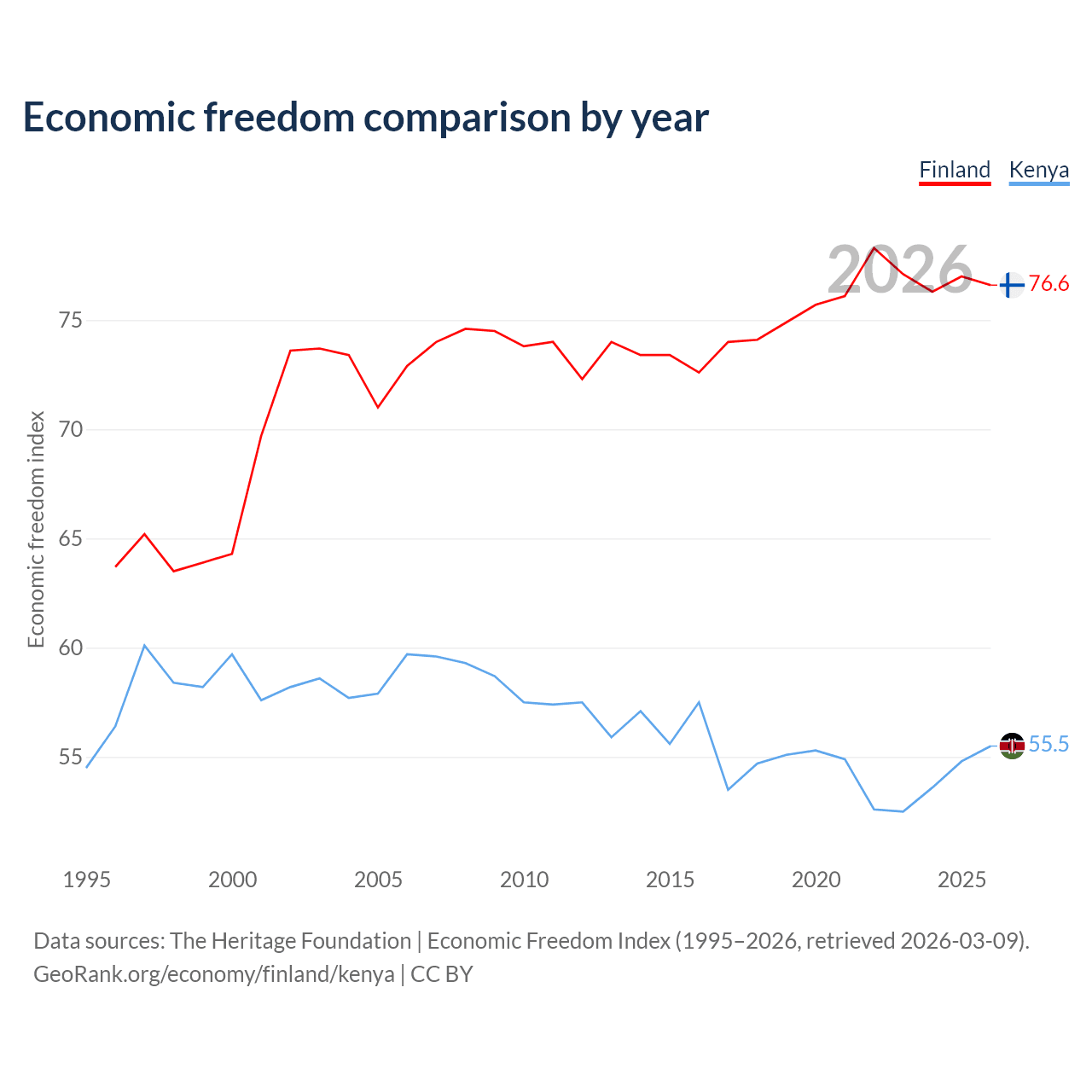 The Economic Freedom Index for Finland is 76.6, ranking 15/197, compared to 55.5 for Kenya, ranking 128/197. The chart above displays a comparison of annual changes in economic freedom indexes.