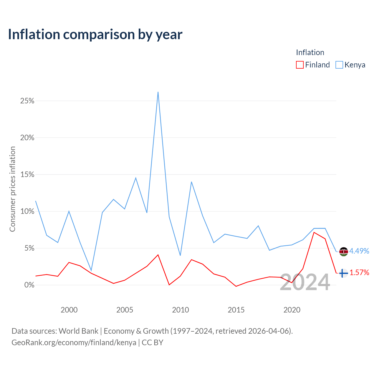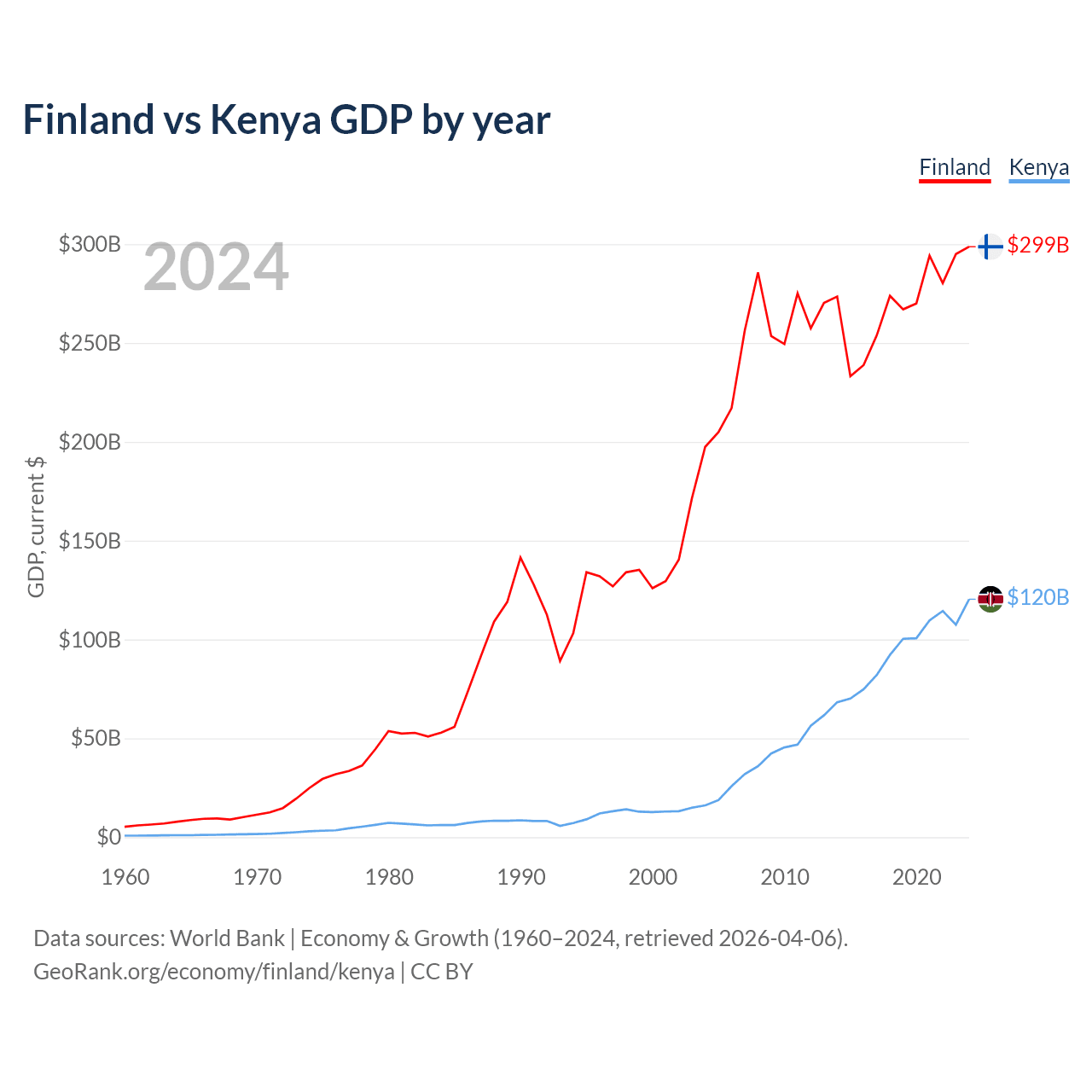Finland has a GDP of $299B compared to $120B for Kenya, ranking 47/197 and 64/197 by economy size, respectively.