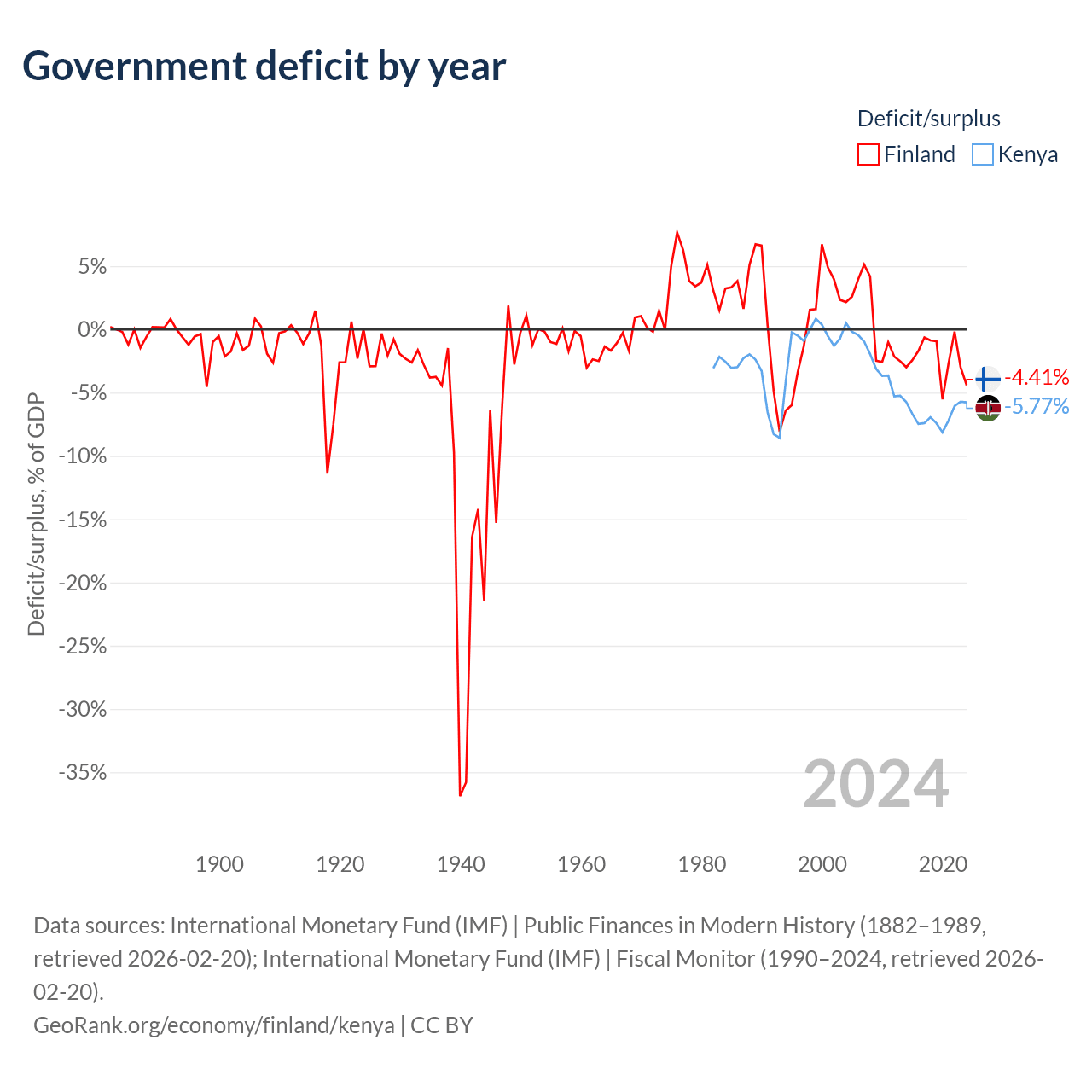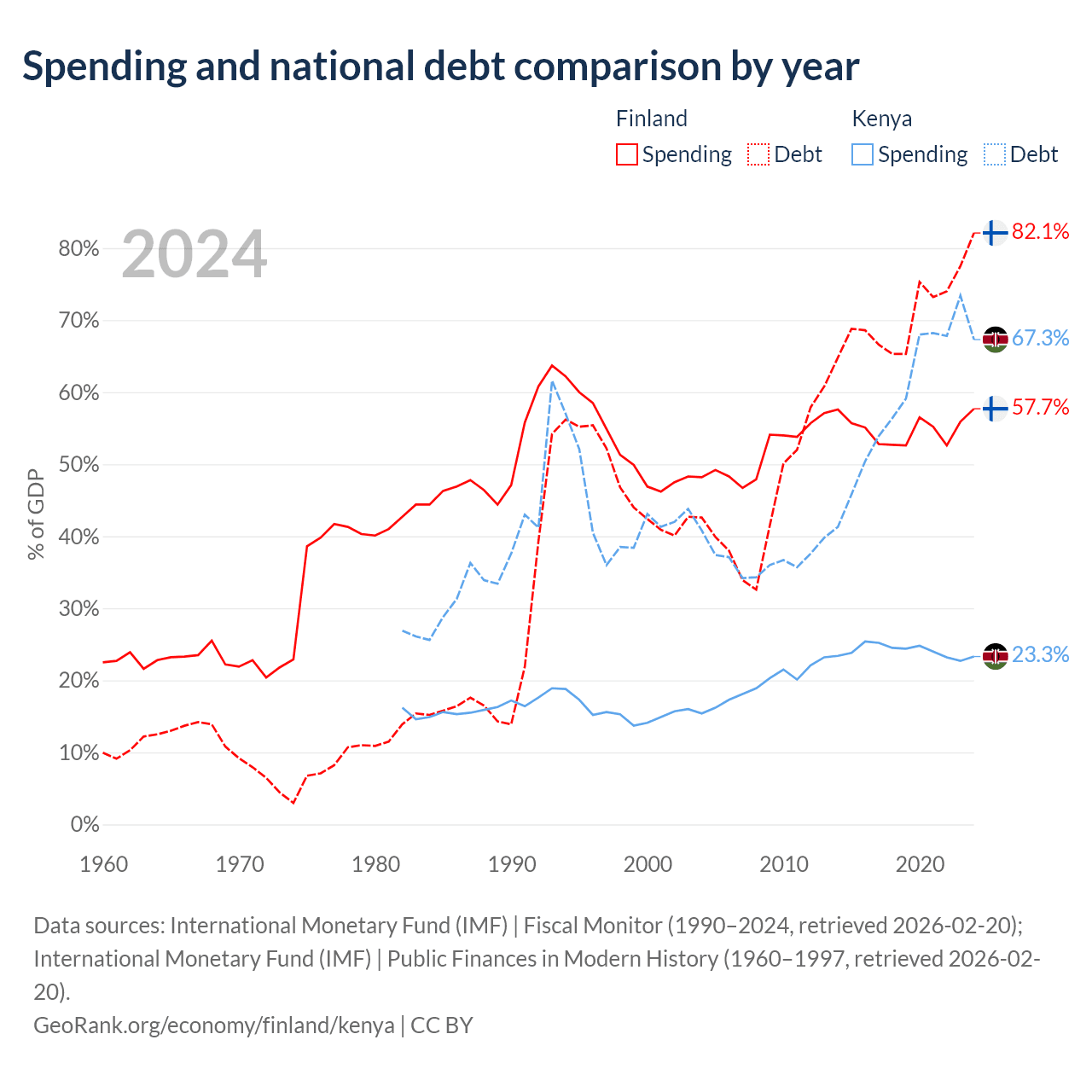 Finland has $245B in government debt (82.1% of GDP), compared to $81B (67.3% of GDP) in Kenya.
