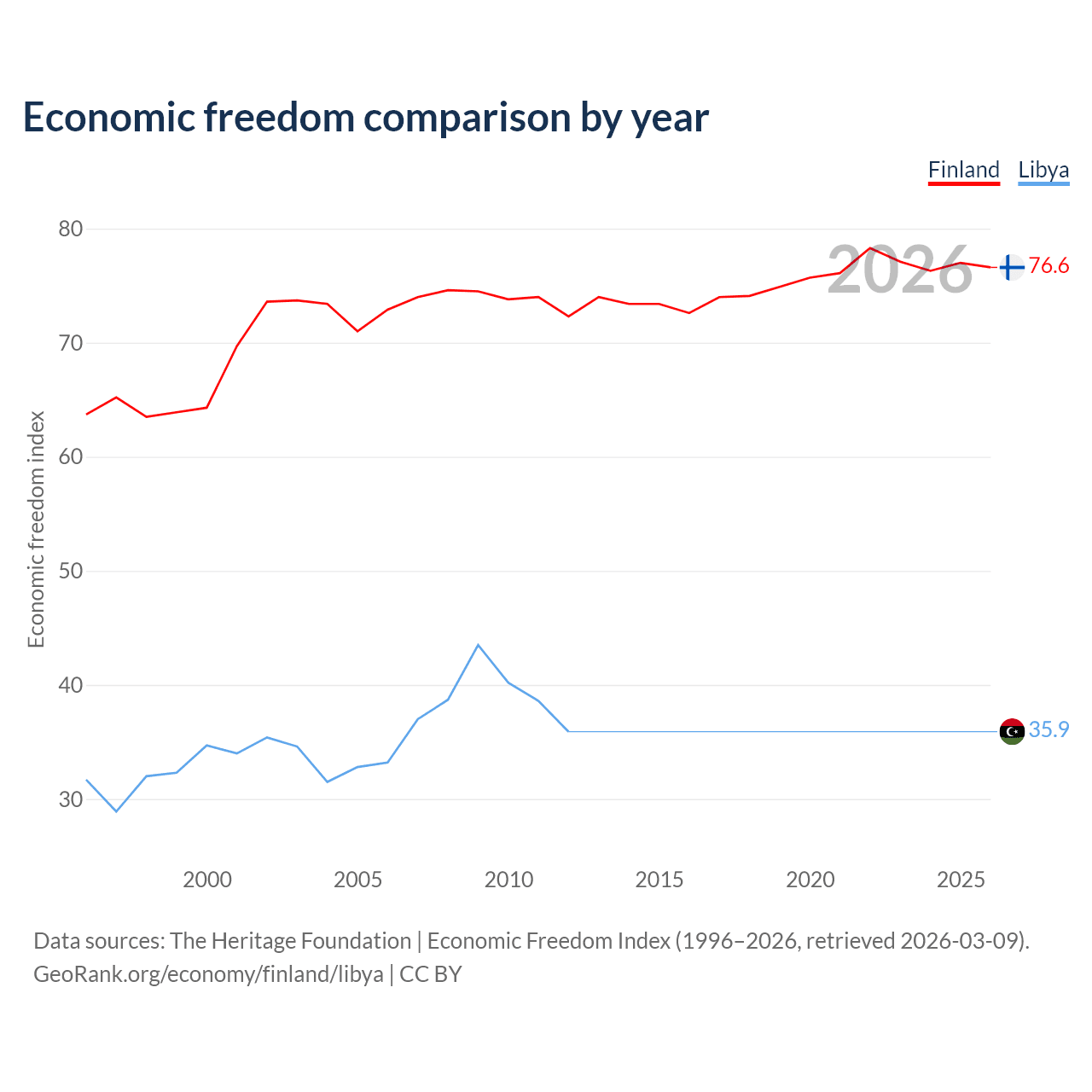 The Economic Freedom Index for Finland is 76.6, ranking 15/197, compared to 35.9 for Libya, ranking 189/197. The chart above displays a comparison of annual changes in economic freedom indexes.