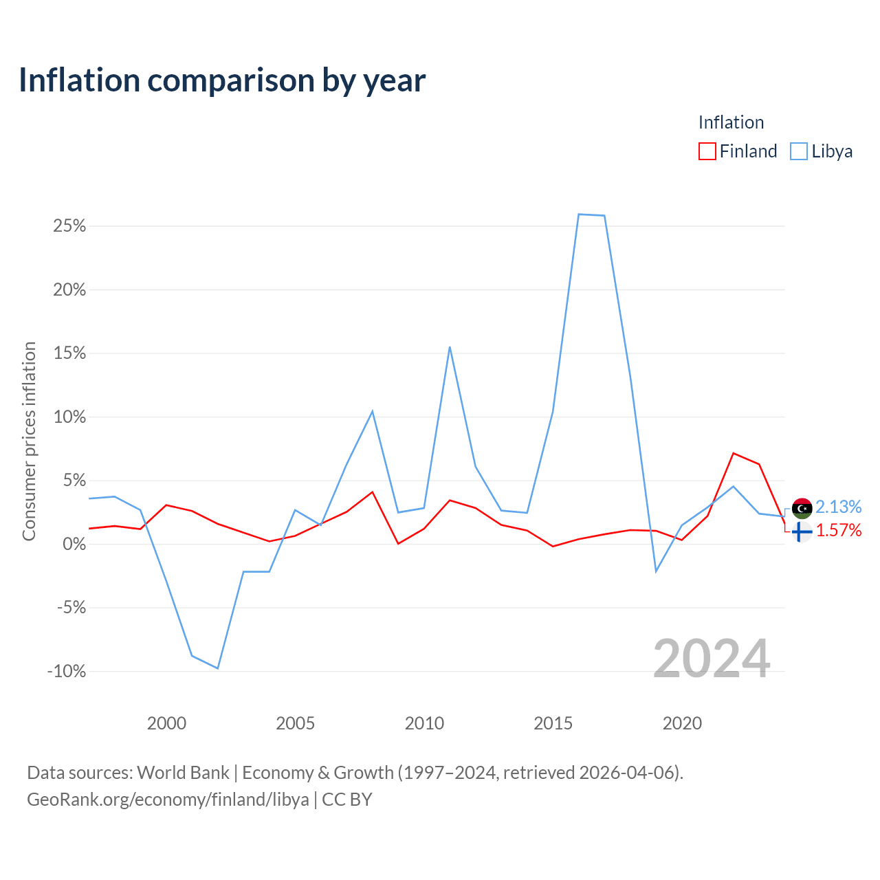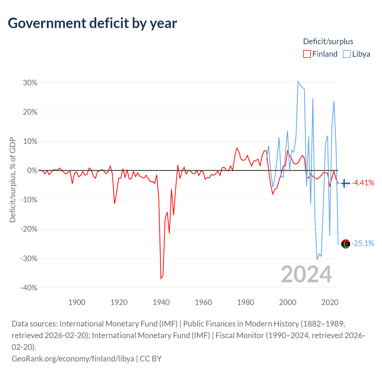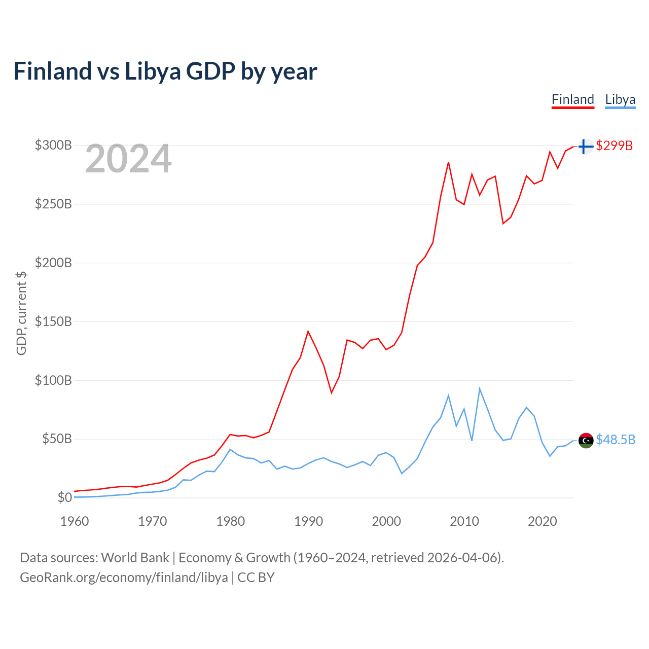 Finland has a GDP of $299B compared to $48.5B for Libya, ranking 47/197 and 95/197 by economy size, respectively.