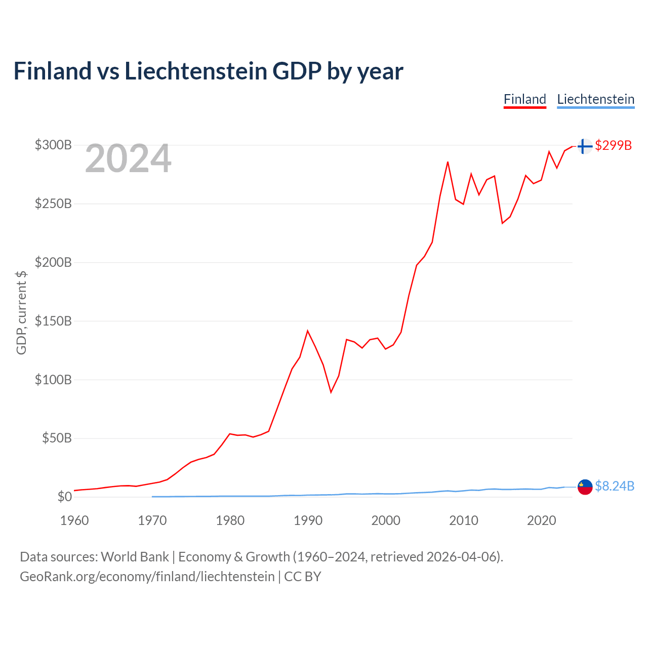 Finland has a GDP of $299B compared to $8.24B for Liechtenstein, ranking 47/197 and 156/197 by economy size, respectively.