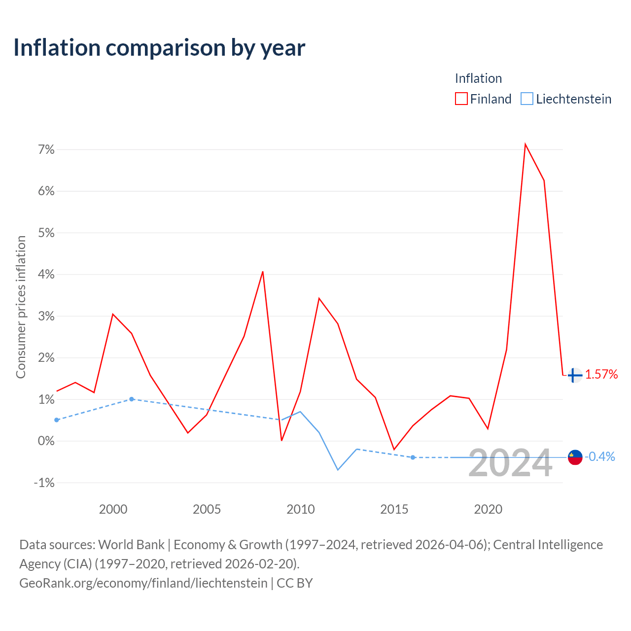 Over the past 24 years, Finland has recorded an average annual inflation rate of 1.42%, compared with 0.04% in Liechtenstein. In 2020, inflation was 1.57% in Finland and -0.4% in Liechtenstein.