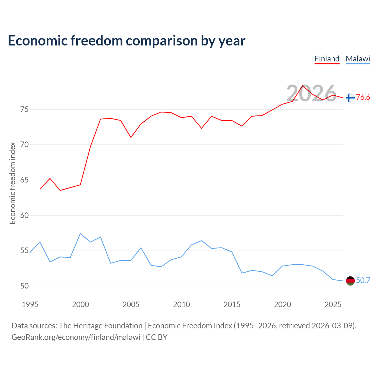 The Economic Freedom Index for Finland is 76.6, ranking 15/197, compared to 50.7 for Malawi, ranking 159/197. The chart above displays a comparison of annual changes in economic freedom indexes.