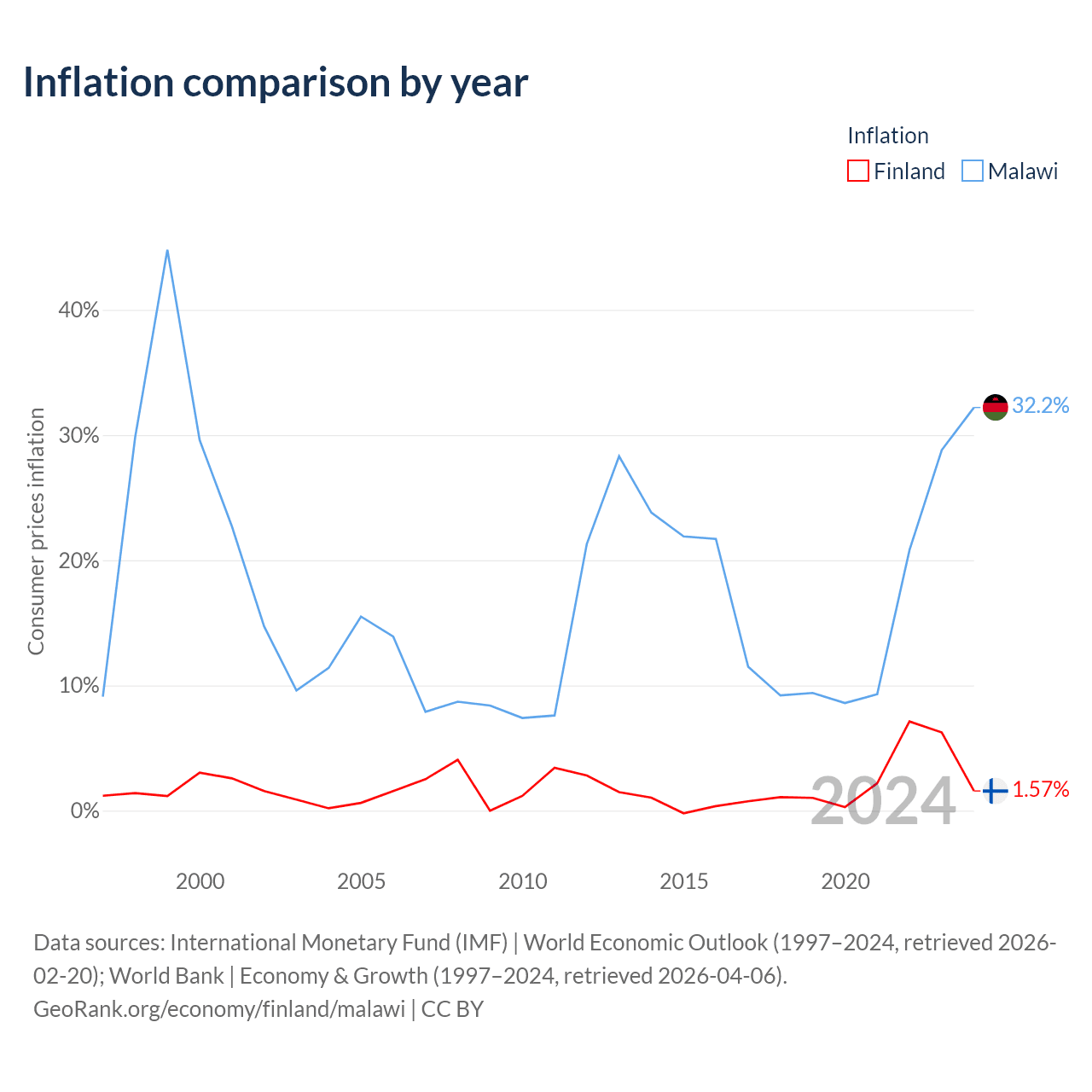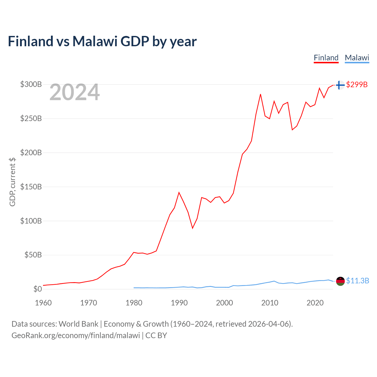 Finland has a GDP of $299B compared to $11.3B for Malawi, ranking 47/197 and 151/197 by economy size, respectively.