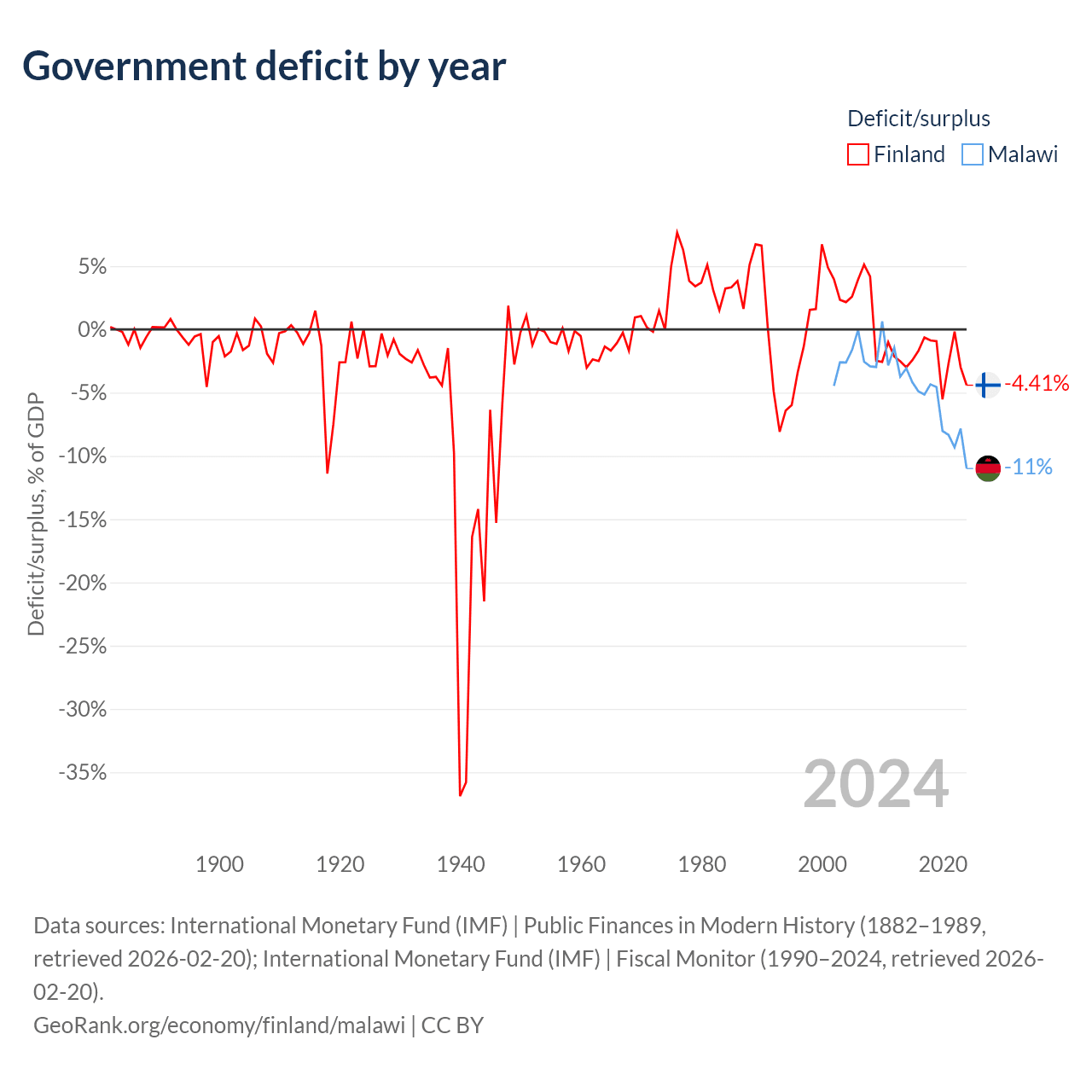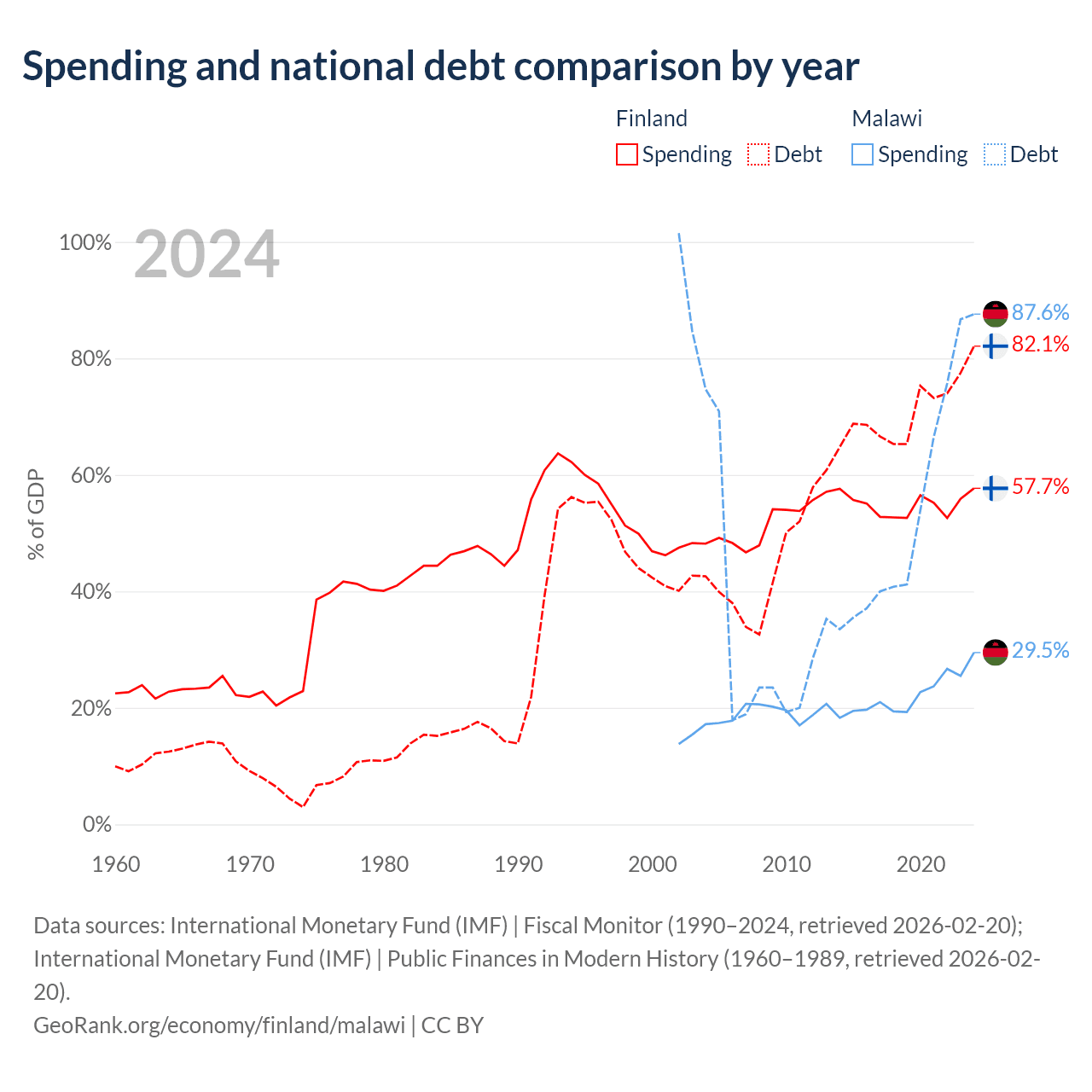 Finland has $245B in government debt (82.1% of GDP), compared to $9.91B (87.6% of GDP) in Malawi.