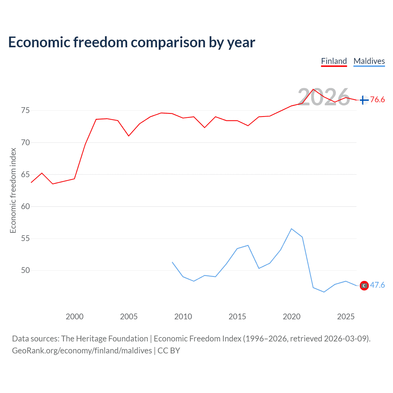 The Economic Freedom Index for Finland is 76.6, ranking 15/197, compared to 47.6 for Maldives, ranking 174/197. The chart above displays a comparison of annual changes in economic freedom indexes.