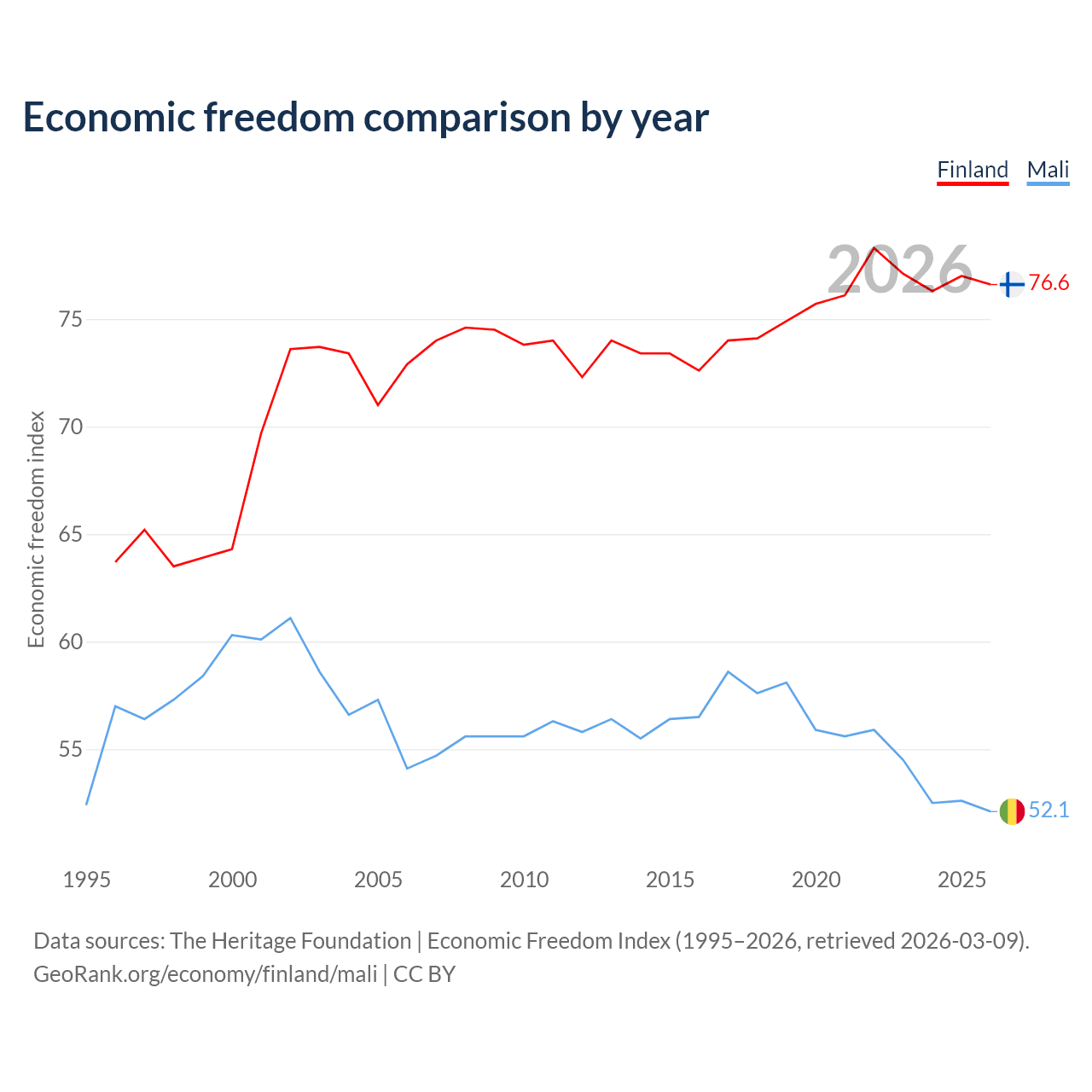 The Economic Freedom Index for Finland is 76.6, ranking 15/197, compared to 52.1 for Mali, ranking 150/197. The chart above displays a comparison of annual changes in economic freedom indexes.
